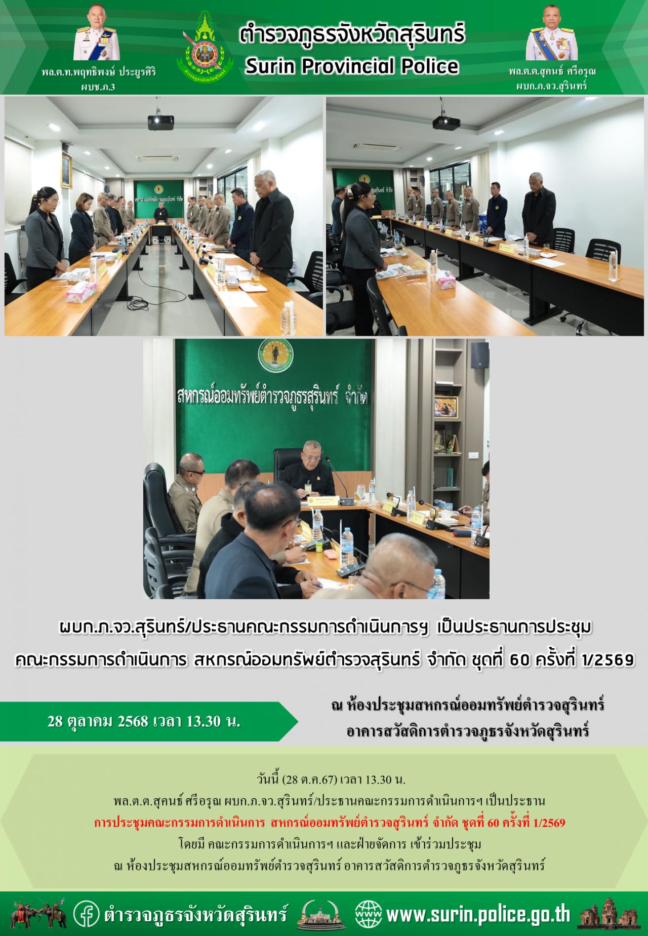 28 ต.ค. 2568 17:44:17 วันนี้ (28 ต.ค.67) เวลา 13.30 น. พล.ต.ต.สุคนธ์ ศรีอรุณ ผบก.ภ.จว.สุรินทร์/ประธานคณะกรรมการดำเนินการฯ เป็นประธานการประชุมคณะกรรมการดำเนินการ สหกรณ์ออมทรัพย์ตำรวจสุรินทร์ จำกัด ชุดที่ 60 ครั้งที่ 1/2569 โดยมี คณะกรรมการดำเนินการฯ และฝ่ายจัดการ เข้าร่วมประชุม ณ ห้องประชุมสหกรณ์ออมทรัพย์ตำรวจสุรินทร์...