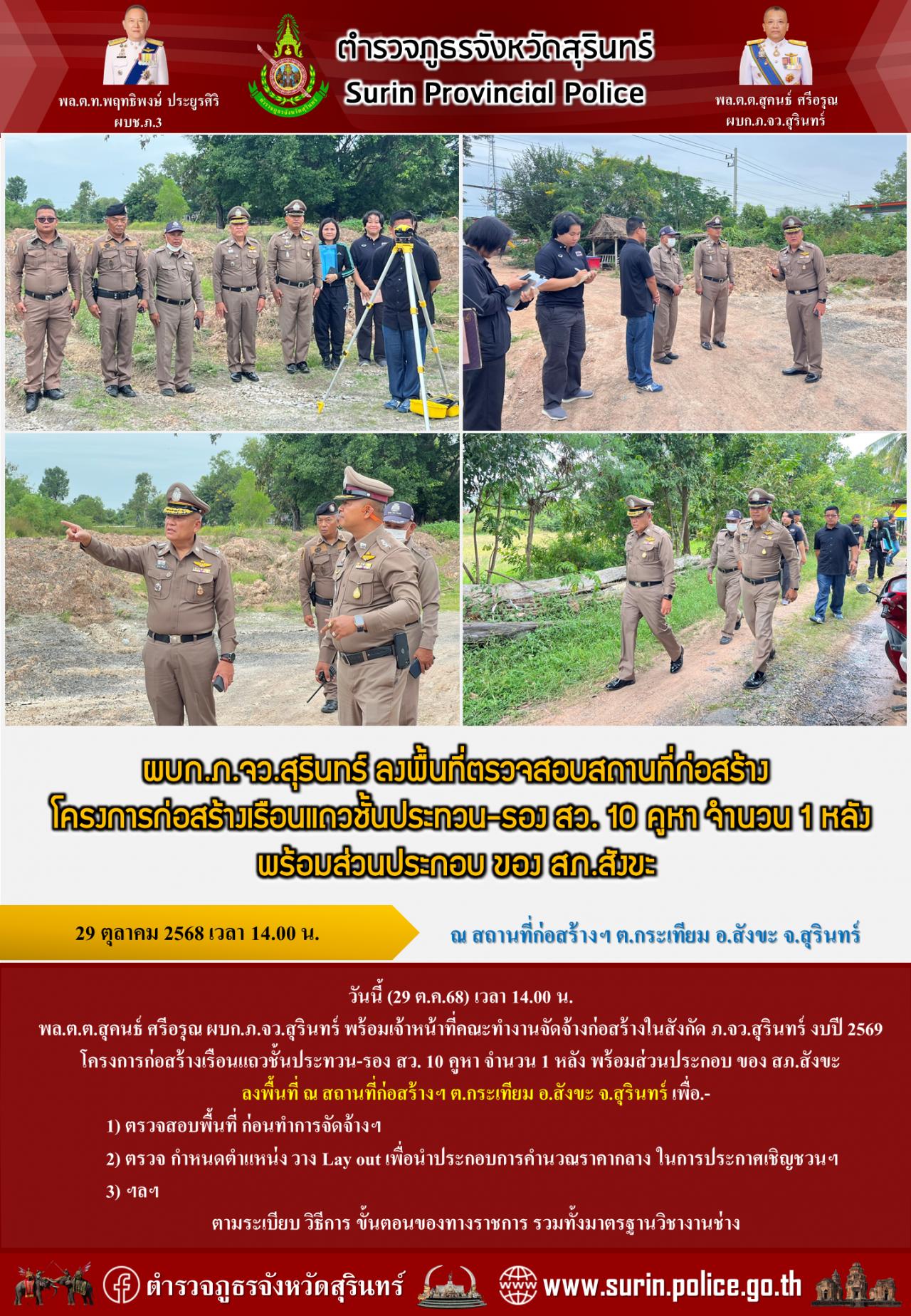 29 ต.ค. 2568 17:02:02 วันนี้ (29 ต.ค.68) เวลา 14.00 น. พล.ต.ต.สุคนธ์ ศรีอรุณ ผบก.ภ.จว.สุรินทร์ พร้อมเจ้าหน้าที่คณะทำงานจัดจ้างก่อสร้างในสังกัด ภ.จว.สุรินทร์ งบปี 2569 โครงการก่อสร้างเรือนแถวชั้นประทวน-รอง สว. 10 คูหา จำนวน 1 หลัง พร้อมส่วนประกอบ ของ สภ.สังขะ ลงพื้นที่ ณ สถานที่ก่อสร้างฯ ต.กระเทียม อ.สังขะ จ.สุริ...