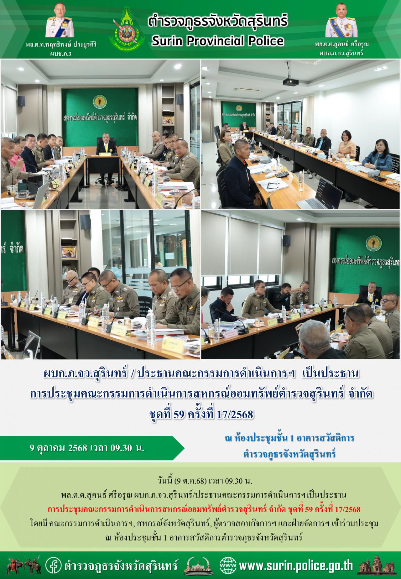 9 ต.ค. 2568 14:31:00ผบก.ภ.จว.สุรินทร์ / ประธานคณะกรรมการดำเนินการฯ เป็นประธานการประชุมคณะกรรมการดำเนินการสหกรณ์ออมทรัพย์ตำรวจสุรินทร์ จำกัด ชุดที่ 59 ครั้งที่ 17/2568 วันนี้ (9 ต.ค.68) เวลา 09.30 น. พล.ต.ต.สุคนธ์ ศรีอรุณ ผบก.ภ.จว.สุรินทร์/ประธานคณะกรรมการดำเนินการฯ เป็นประธานการประชุมคณะกรรมการดำเนินการสหกรณ์ออมทรัพ...