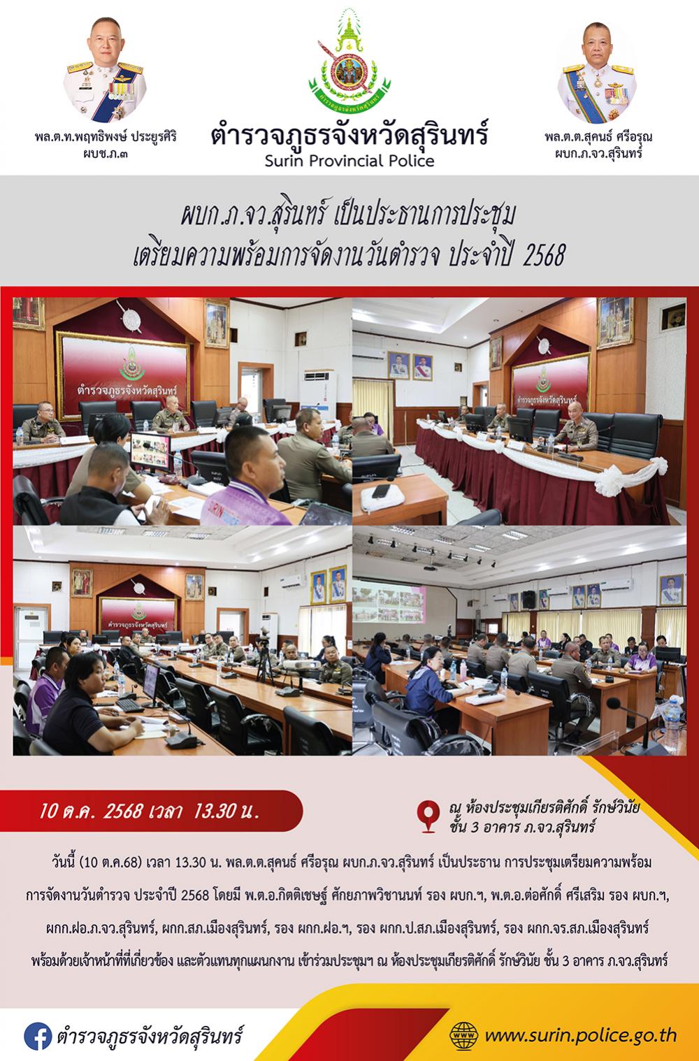 10 ต.ค. 2568 19:45:07ผบก.ภ.จว.สุรินทร์ เป็นประธานการประชุม เตรียมความพร้อมการจัดงานวันตำรวจ ประจำปี 2568 วันนี้ (10 ต.ค.68) เวลา 13.30 น. พล.ต.ต.สุคนธ์ ศรีอรุณ ผบก.ภ.จว.สุรินทร์ เป็นประธาน การประชุมเตรียมความพร้อม การจัดงานวันตำรวจ ประจำปี 2568 โดยมี พ.ต.อ.กิตติเชษฐ์ ศักยภาพวิชานนท์ รอง ผบก.ฯ, พ.ต.อ.ต่อศักดิ์ ศรีเสริม...