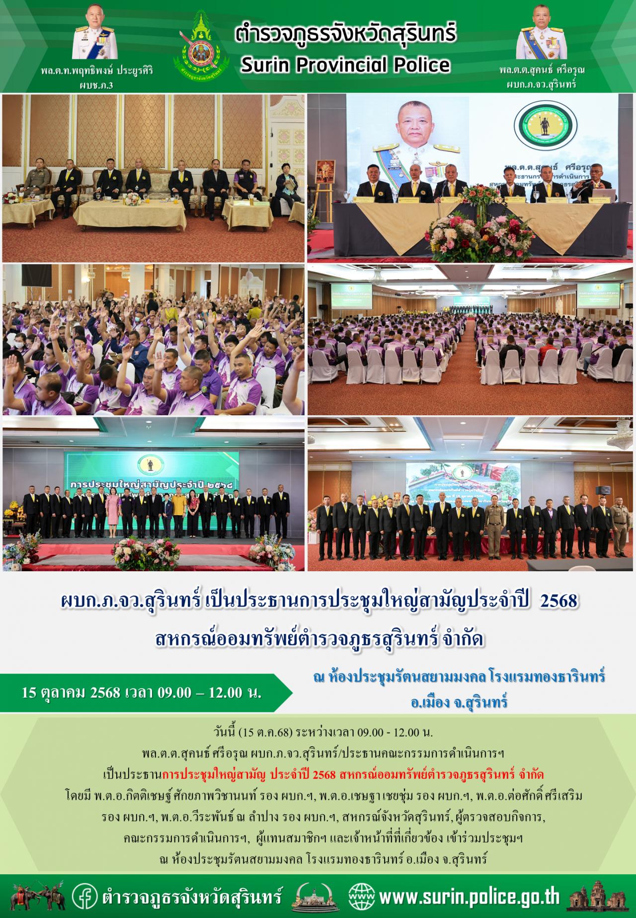 15 ต.ค. 2568 18:36:19วันนี้ (15 ต.ค.68) ระหว่างเวลา 09.00 - 12.00 น. พล.ต.ต.สุคนธ์ ศรีอรุณ ผบก.ภ.จว.สุรินทร์/ประธานคณะกรรมการดำเนินการฯ เป็นประธานการประชุมใหญ่สามัญ ประจำปี 2568 สหกรณ์ออมทรัพย์ตำรวจภูธรสุรินทร์ จำกัด โดยมี พ.ต.อ.กิตติเชษฐ์ ศักยภาพวิชานนท์ รอง ผบก.ฯ, พ.ต.อ.เชษฐา เชยชุ่ม รอง ผบก.ฯ, พ.ต.อ.ต่อศักดิ์ ศรีเสร...