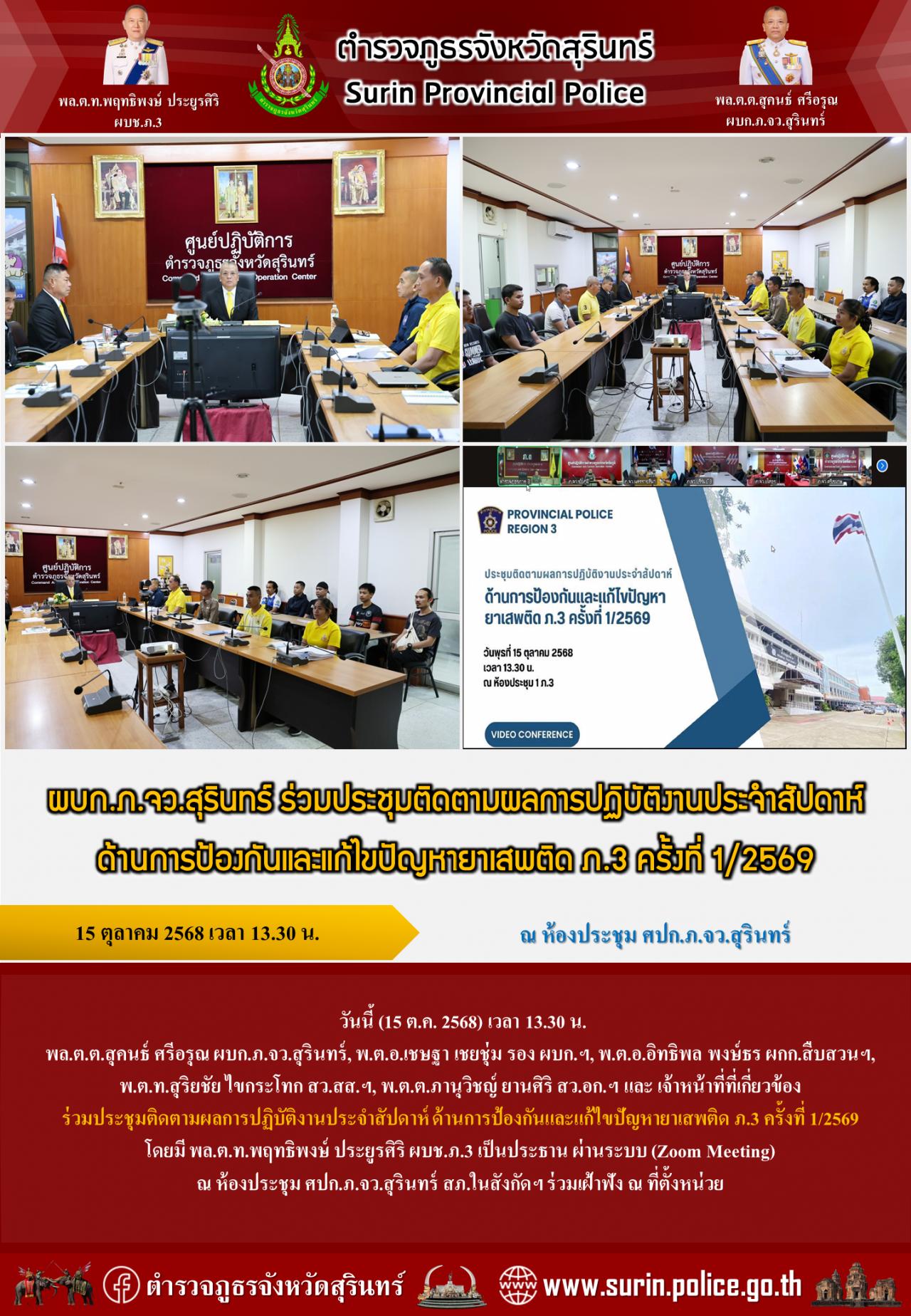 15 ต.ค. 2568 18:36:24ผบก.ภ.จว.สุรินทร์ ร่วมประชุมติดตามผลการปฏิบัติงานประจำสัปดาห์ ด้านการป้องกันและแก้ไขปัญหายาเสพติด ภ.3 ครั้งที่ 1/2569 วันนี้ (15 ต.ค. 2568) เวลา 13.30 น. พล.ต.ต.สุคนธ์ ศรีอรุณ ผบก.ภ.จว.สุรินทร์, พ.ต.อ.เชษฐา เชยชุ่ม รอง ผบก.ฯ, พ.ต.อ.อิทธิพล พงษ์ธร ผกก.สืบสวนฯ, พ.ต.ท.สุริยชัย ไขกระโทก สว.สส.ฯ, พ....