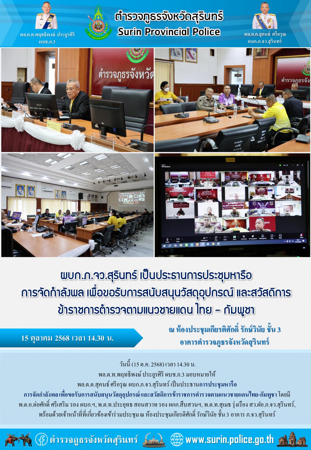 15 ต.ค. 2568 18:36:29ผบก.ภ.จว.สุรินทร์ เป็นประธานการประชุมหารือการจัดกำลังพล เพื่อขอรับการสนับสนุนวัสดุอุปกรณ์ และสวัสดิการข้าราชการตำรวจตามแนวชายแดน ไทย - กัมพูชา วันนี้ (15 ต.ค. 2568) เวลา 14.30 น. พล.ต.ท.พฤทธิพงษ์ ประยูรศิริ ผบช.ภ.3 มอบหมายให้ พล.ต.ต.สุคนธ์ ศรีอรุณ ผบก.ภ.จว.สุรินทร์ เป็นประธานการประชุมหารือการจั...