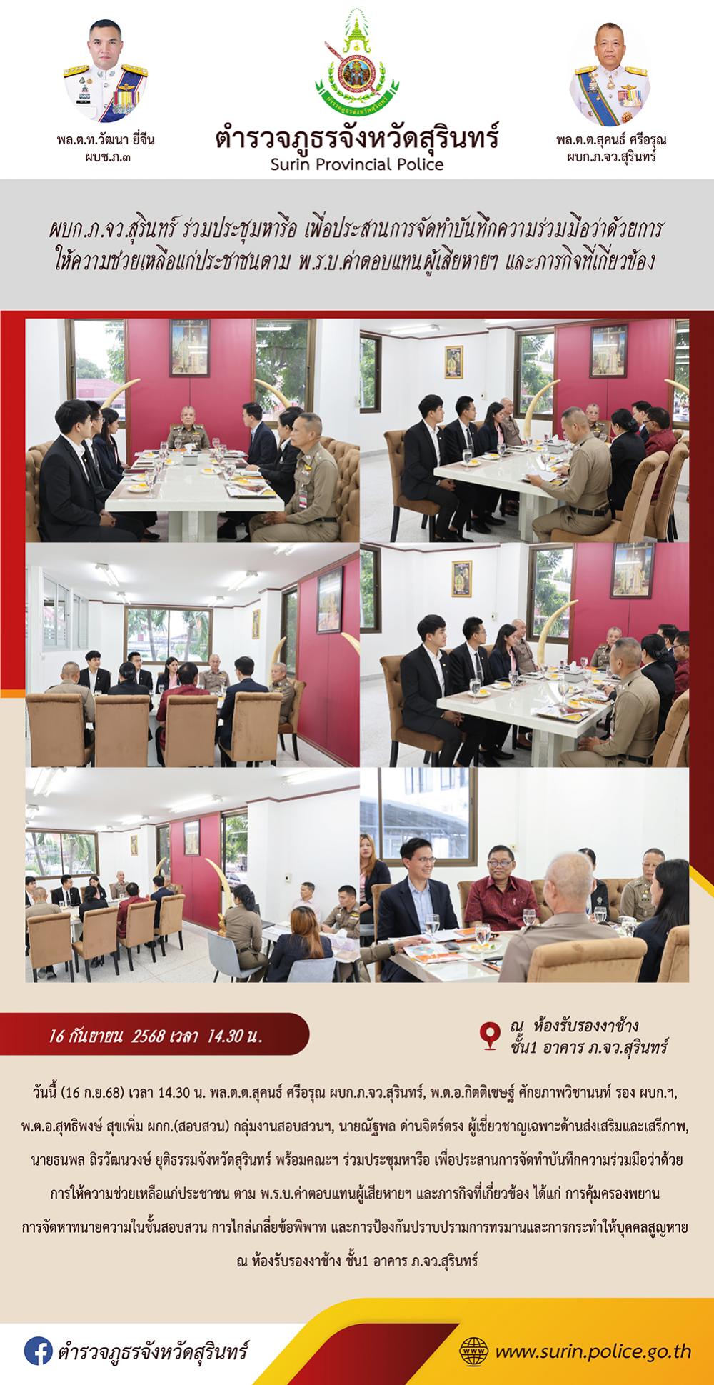 16 ก.ย. 2568 18:29:09ผบก.ภ.จว.สุรินทร์ ร่วมประชุมหารือ เพื่อประสานการจัดทำบันทึกความร่วมมือว่าด้วยการ ให้ความช่วยเหลือแก่ประชาชนตาม พ.ร.บ.ค่าตอบแทนผู้เสียหายฯ และภารกิจที่เกี่ยวข้อง วันนี้ (16 ก.ย.68) เวลา 14.30 น. พล.ต.ต.สุคนธ์ ศรีอรุณ ผบก.ภ.จว.สุรินทร์, พ.ต.อ.กิตติเชษฐ์ ศักยภาพวิชานนท์ รอง ผบก.ฯ, พ.ต.อ.สุทธิพงษ์ สุข...