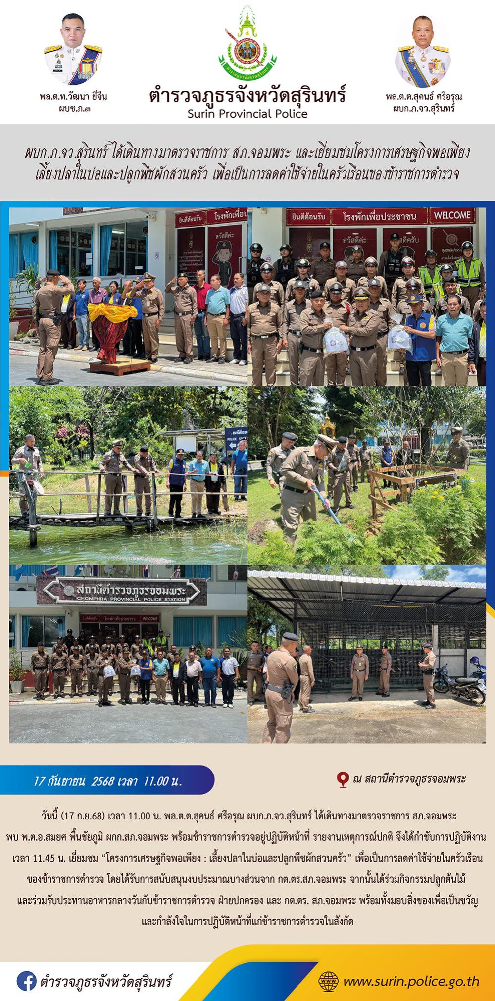 17 ก.ย. 2568 14:26:49ผบก.ภ.จว.สุรินทร์ ได้เดินทางมาตรวจราชการ สภ.จอมพระ และเยี่ยมชมโครงการเศรษฐกิจพอเพียง เลี้ยงปลาในบ่อและปลูกพืชผักสวนครัว เพื่อเป็นการลดค่าใช้จ่ายในครัวเรือนของข้าราชการตำรวจ วันนี้ (17 ก.ย.68) เวลา 11.00 น. พล.ต.ต.สุคนธ์ ศรีอรุณ ผบก.ภ.จว.สุรินทร์ ได้เดินทางมาตรวจราชการ สภ.จอมพระ พบ พ.ต.อ.สมยศ พื้...