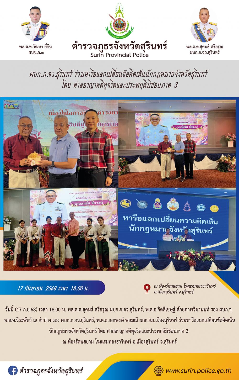 18 ก.ย. 2568 08:50:08วันนี้ (17 ก.ย.68) เวลา 18.00 น. พล.ต.ต.สุคนธ์ ศรีอรุณ ผบก.ภ.จว.สุรินทร์, พ.ต.อ.กิตติเชษฐ์ ศักยภาพวิชานนท์ รอง ผบก.ฯ, พ.ต.อ.วีระพันธ์ ณ ลำปาง รอง ผบก.ภ.จว.สุรินทร์, พ.ต.อ.เอกพงษ์ พลมณี ผกก.สภ.เมืองสุรินทร์ ร่วมหารือแลกเปลี่ยนข้อคิดเห็น นักกฎหมายจังหวัดสุรินทร์ โดย ศาลอาญาคดีทุจริตและประพฤติมิชอบภาค...