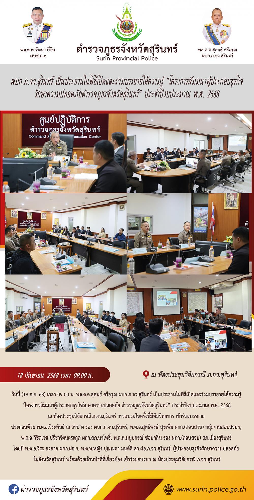 18 ก.ย. 2568 15:36:58ผบก.ภ.จว.สุรินทร์ เป็นประธานในพิธีเปิดและร่วมบรรยายให้ความรู้ “โครงการสัมมนาผู้ประกอบธุรกิจ รักษาความปลอดภัยตำรวจภูธรจังหวัดสุรินทร์” ประจำปีงบประมาณ พ.ศ. 2568 วันนี้ (18 ก.ย. 68) เวลา 09.00 น. พล.ต.ต.สุคนธ์ ศรีอรุณ ผบก.ภ.จว.สุรินทร์ เป็นประธานในพิธีเปิดและร่วมบรรยายให้ความรู้ “โครงการสัมมนาผู้ประ...