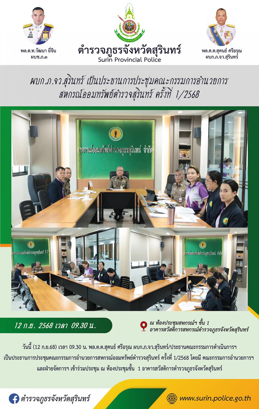 12 ก.ย. 2568 14:39:52ผบก.ภ.จว.สุรินทร์ เป็นประธานการประชุมคณะกรรมการอำนวยการ สหกรณ์ออมทรัพย์ตำรวจสุรินทร์ ครั้งที่ 1/2568 วันนี้ (12 ก.ย.68) เวลา 09.30 น. พล.ต.ต.สุคนธ์ ศรีอรุณ ผบก.ภ.จว.สุรินทร์/ประธานคณะกรรมการดำเนินการฯ เป็นประธานการประชุมคณะกรรมการอำนวยการสหกรณ์ออมทรัพย์ตำรวจสุรินทร์ ครั้งที่ 1/2568 โดยมี คณะกรรมก...