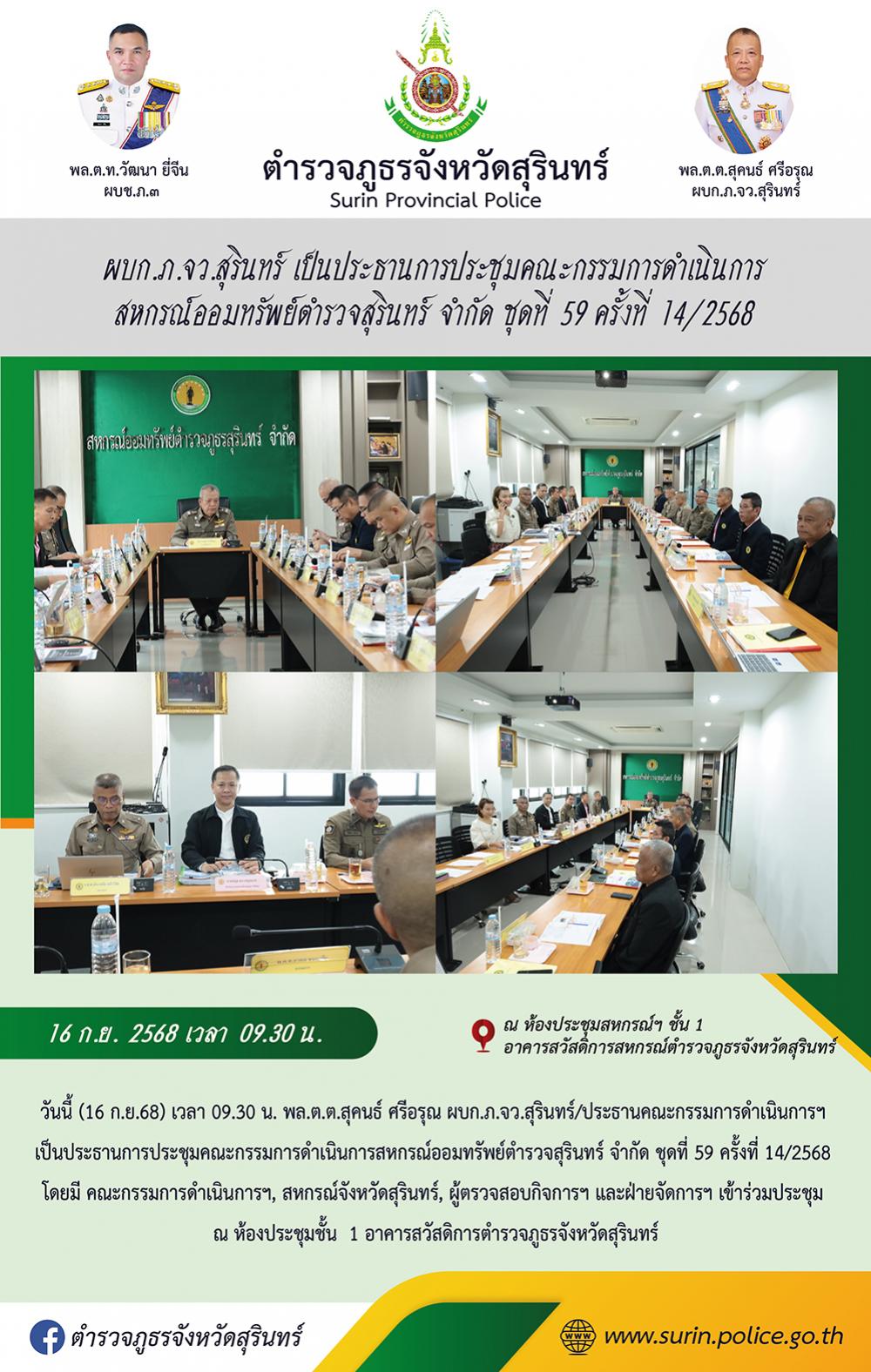 16 ก.ย. 2568 13:25:17ผบก.ภ.จว.สุรินทร์ เป็นประธานการประชุมคณะกรรมการดำเนินการ สหกรณ์ออมทรัพย์ตำรวจสุรินทร์ จำกัด ชุดที่ 59 ครั้งที่ 14/2568 วันนี้ (16 ก.ย.68) เวลา 09.30 น. พล.ต.ต.สุคนธ์ ศรีอรุณ ผบก.ภ.จว.สุรินทร์/ประธานคณะกรรมการดำเนินการฯ เป็นประธานการประชุมคณะกรรมการดำเนินการสหกรณ์ออมทรัพย์ตำรวจสุรินทร์ จำกัด ชุดที่...