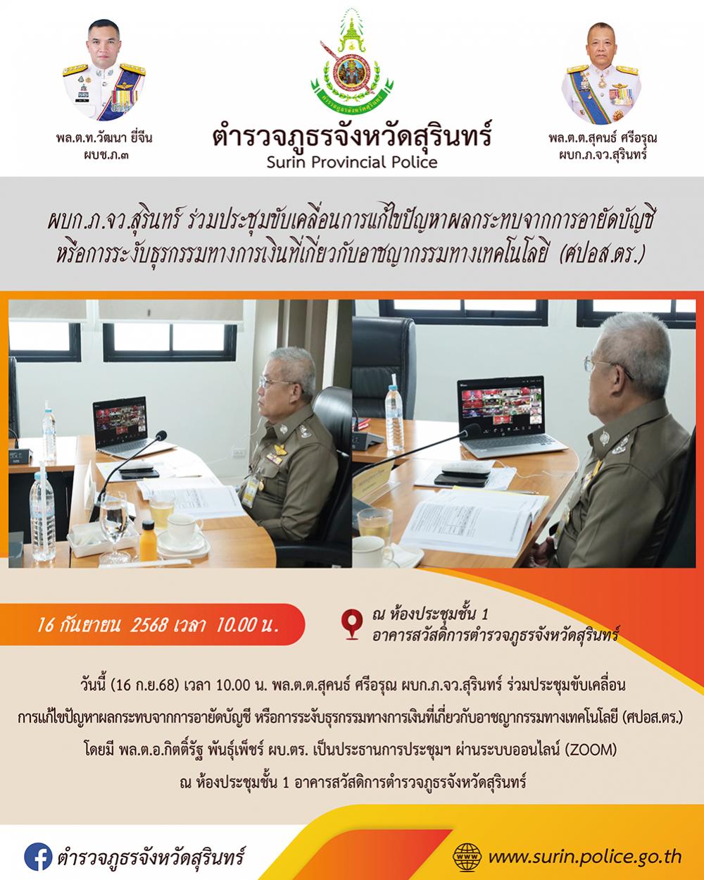 16 ก.ย. 2568 13:43:14ผบก.ภ.จว.สุรินทร์ ร่วมประชุมขับเคลื่อนการแก้ไขปัญหาผลกระทบจากการอายัดบัญชี หรือการระงับธุรกรรมทางการเงินที่เกี่ยวกับอาชญากรรมทางเทคโนโลยี (ศปอส.ตร.) วันนี้ (16 ก.ย.68) เวลา 10.00 น. พล.ต.ต.สุคนธ์ ศรีอรุณ ผบก.ภ.จว.สุรินทร์ ร่วมประชุมขับเคลื่อน การแก้ไขปัญหาผลกระทบจากการอายัดบัญชี หรือการระงับธุรกรรม...