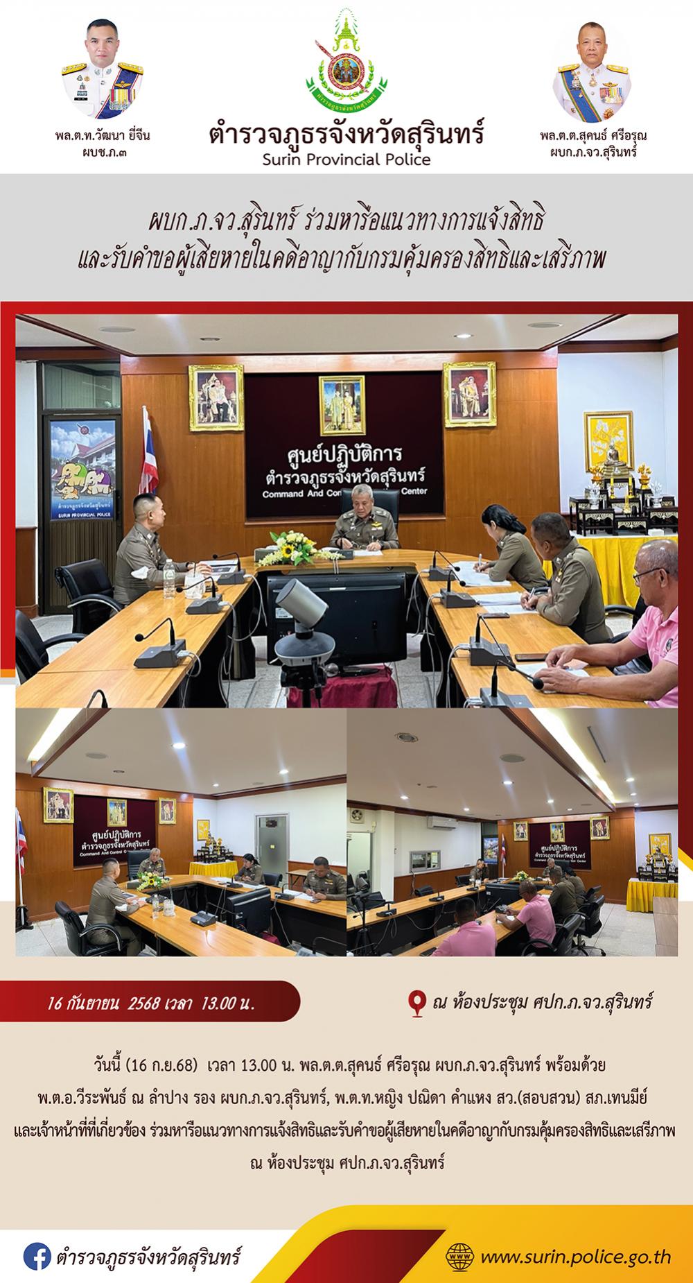 16 ก.ย. 2568 14:01:45ผบก.ภ.จว.สุรินทร์ ร่วมหารือแนวทางการแจ้งสิทธิ และรับคำขอผู้เสียหายในคดีอาญากับกรมคุ้มครองสิทธิและเสรีภาพ วันนี้ (16 ก.ย.68) เวลา 13.00 น. พล.ต.ต.สุคนธ์ ศรีอรุณ ผบก.ภ.จว.สุรินทร์ พร้อมด้วย พ.ต.อ.วีระพันธ์ ณ ลำปาง รอง ผบก.ภ.จว.สุรินทร์, พ.ต.ท.หญิง ปณิดา คำแหง สว.(สอบสวน) สภ.เทนมีย์ และเจ้าหน้าที...