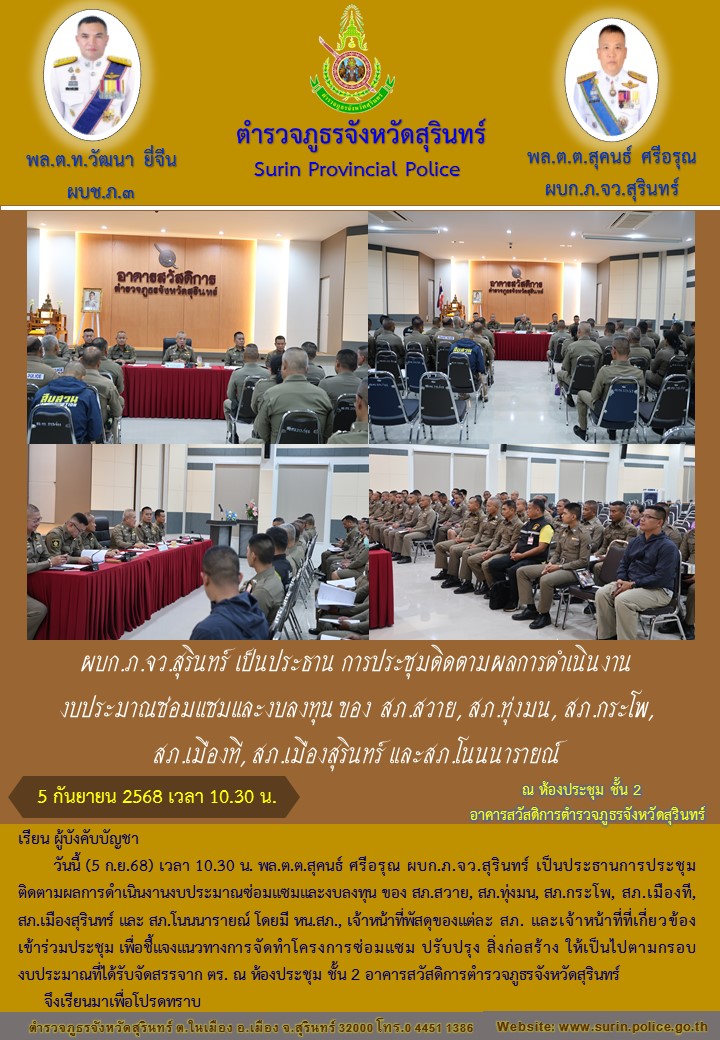 5 ก.ย. 2568 16:00:11ผบก.ภ.จว.สุรินทร์ เป็นประธานการประชุมติดตามผลการดำเนินงานงบประมาณซ่อมแซมและงบลงทุน ของ สภ.สวาย, สภ.ทุ่งมน, สภ.กระโพ, สภ.เมืองที, สภ.เมืองสุรินทร์ และ สภ.โนนนารายณ์ โดยมี หน.สภ. , เจ้าหน้าที่พัสดุของแต่ละ สภ. และเจ้าหน้าที่ที่เกี่ยวข้อง เข้าร่วมประชุม เพื่อชี้แจงแนวทางการจัดทำโครงการซ่อมแซม ...