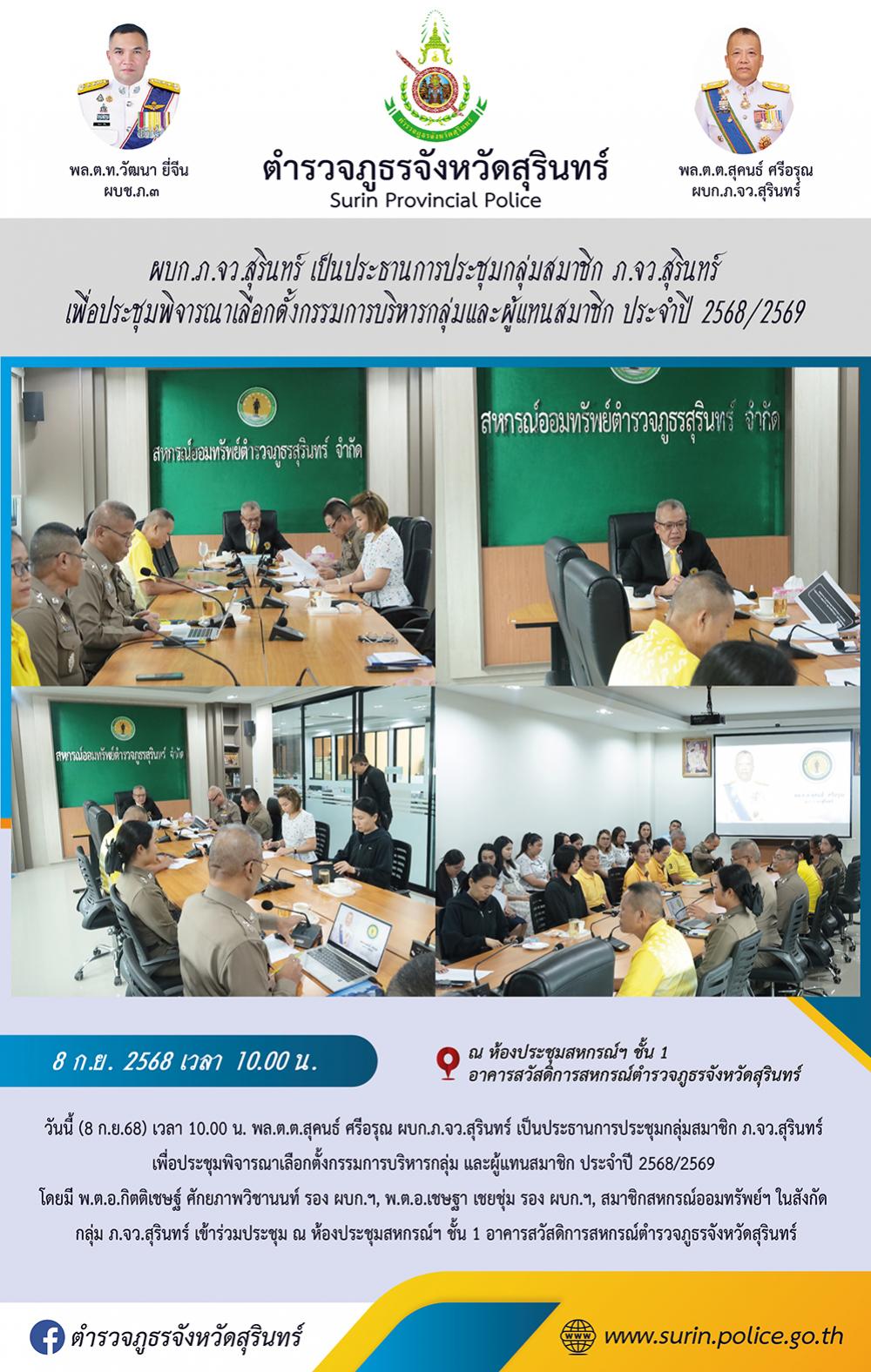 8 ก.ย. 2568 15:19:13ผบก.ภ.จว.สุรินทร์ เป็นประธานการประชุมกลุ่มสมาชิก ภ.จว.สุรินทร์ เพื่อประชุมพิจารณาเลือกตั้งกรรมการบริหารกลุ่มและผู้แทนสมาชิก ประจำปี 2568/2569 วันนี้ (8 ก.ย.68) เวลา 10.00 น. พล.ต.ต.สุคนธ์ ศรีอรุณ ผบก.ภ.จว.สุรินทร์ เป็นประธานการประชุมกลุ่มสมาชิก ภ.จว.สุรินทร์ เพื่อประชุมพิจารณาเลือกตั้งกรรมการบริหา...