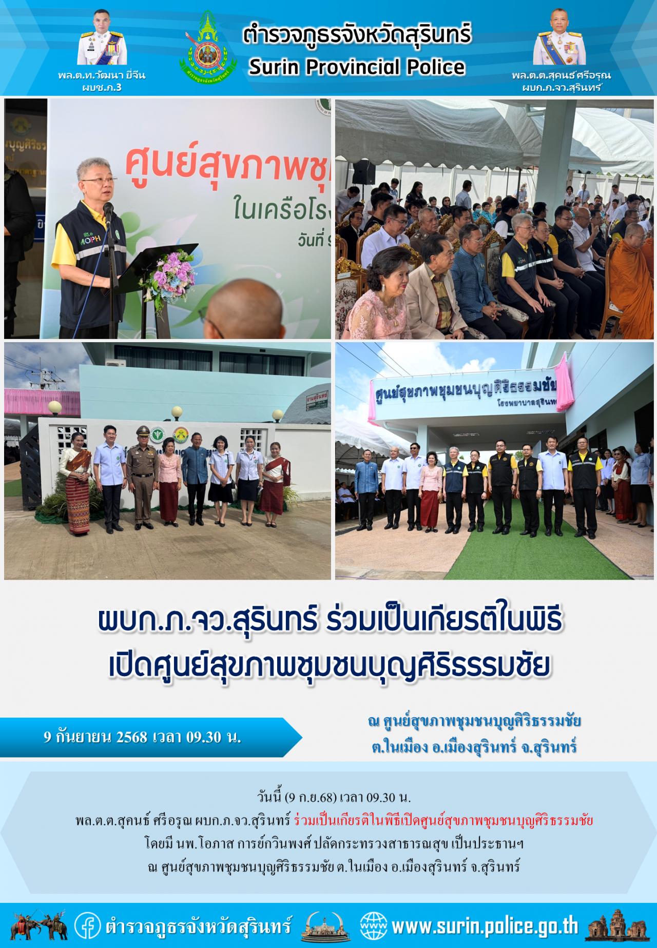 9 ก.ย. 2568 13:21:04วันนี้ (9 ก.ย.68) เวลา 09.30 น. พล.ต.ต.สุคนธ์ ศรีอรุณ ผบก.ภ.จว.สุรินทร์ ร่วมเป็นเกียรติในพิธีเปิดศูนย์สุขภาพชุมชนบุญศิริธรรมชัย โดยมี นพ.โอภาส การย์กวินพงศ์ ปลัดกระทรวงสาธารณสุข เป็นประธานฯ ณ ศูนย์สุขภาพชุมชนบุญศิริธรรมชัย ต.ในเมือง อ.เมืองสุรินทร์ จ.สุรินทร์ ...