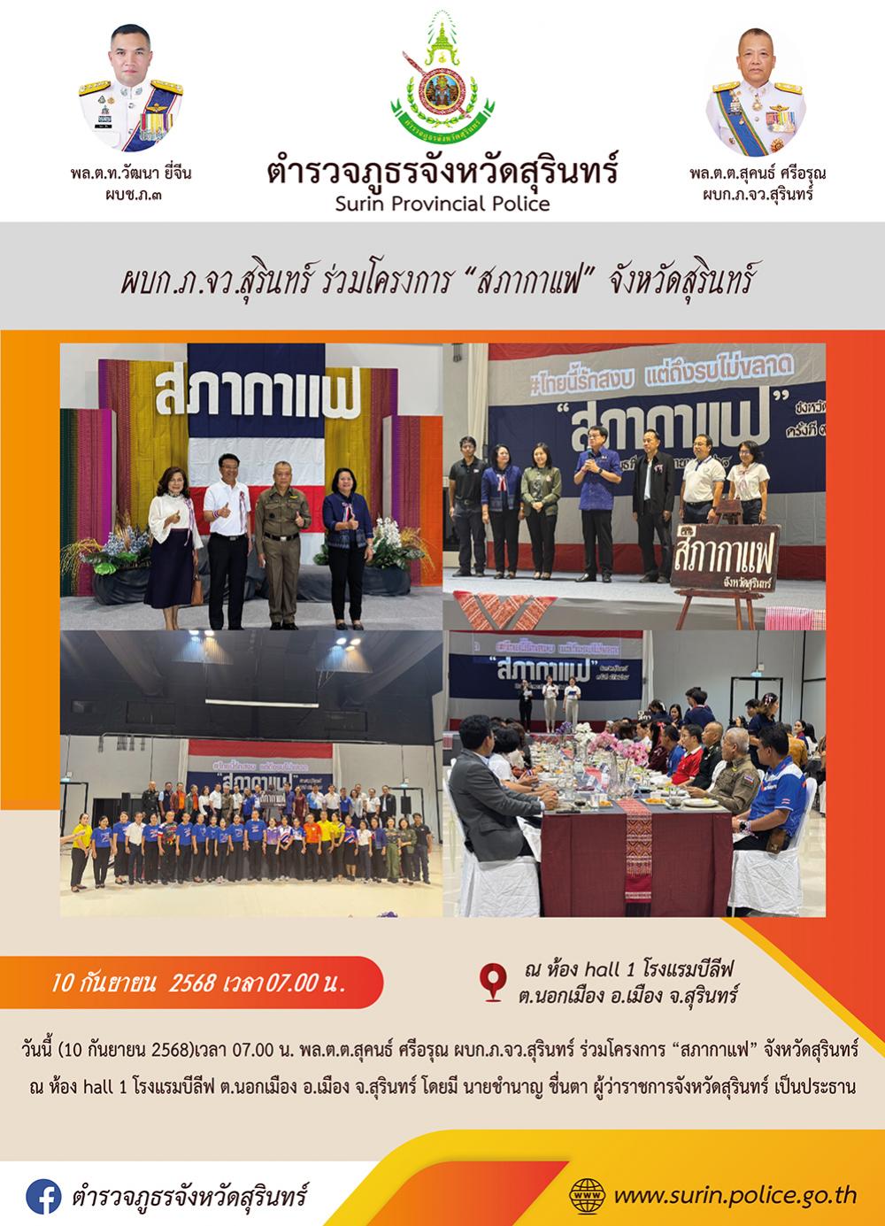 10 ก.ย. 2568 10:17:26ผบก.ภ.จว.สุรินทร์ ร่วมโครงการ “สภากาแฟ” จังหวัดสุรินทร์ วันนี้ (10 กันยายน 2568)เวลา 07.00 น. พล.ต.ต.สุคนธ์ ศรีอรุณ ผบก.ภ.จว.สุรินทร์ ร่วมโครงการ “สภากาแฟ” จังหวัดสุรินทร์ ณ ห้อง hall 1 โรงแรมบีลีฟ ต.นอกเมือง อ.เมือง จ.สุรินทร์ โดยมี นายชำนาญ ชื่นตา ผู้ว่าราชการจังหวัดสุรินทร์ เป็นประธาน...