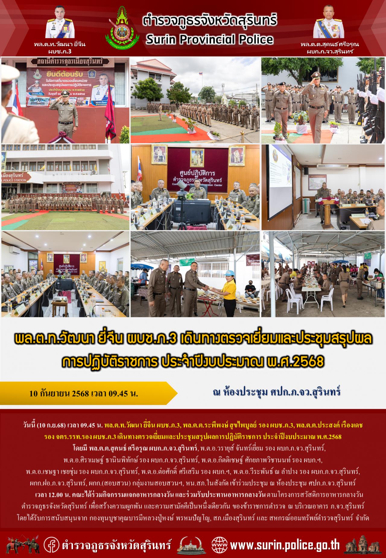 10 ก.ย. 2568 18:32:40พล.ต.ท.วัฒนา ยี่จีน ผบช.ภ.3 เดินทางตรวจเยี่ยมและประชุมสรุปผลการปฏิบัติราชการ ประจำปีงบประมาณ พ.ศ.2568 วันนี้ (10 ก.ย.68) เวลา 09.45 น. พล.ต.ท.วัฒนา ยี่จีน ผบช.ภ.3, พล.ต.ต.ระพีพงษ์ สุขไพบูลย์ รอง ผบช.ภ.3, พล.ต.ต.ประสงค์ เรืองเดช รอง จตร.รรท.รอง ผบช.ภ.3 เดินทางตรวจเยี่ยมและประชุมสรุปผลการปฏิบัติราชกา...