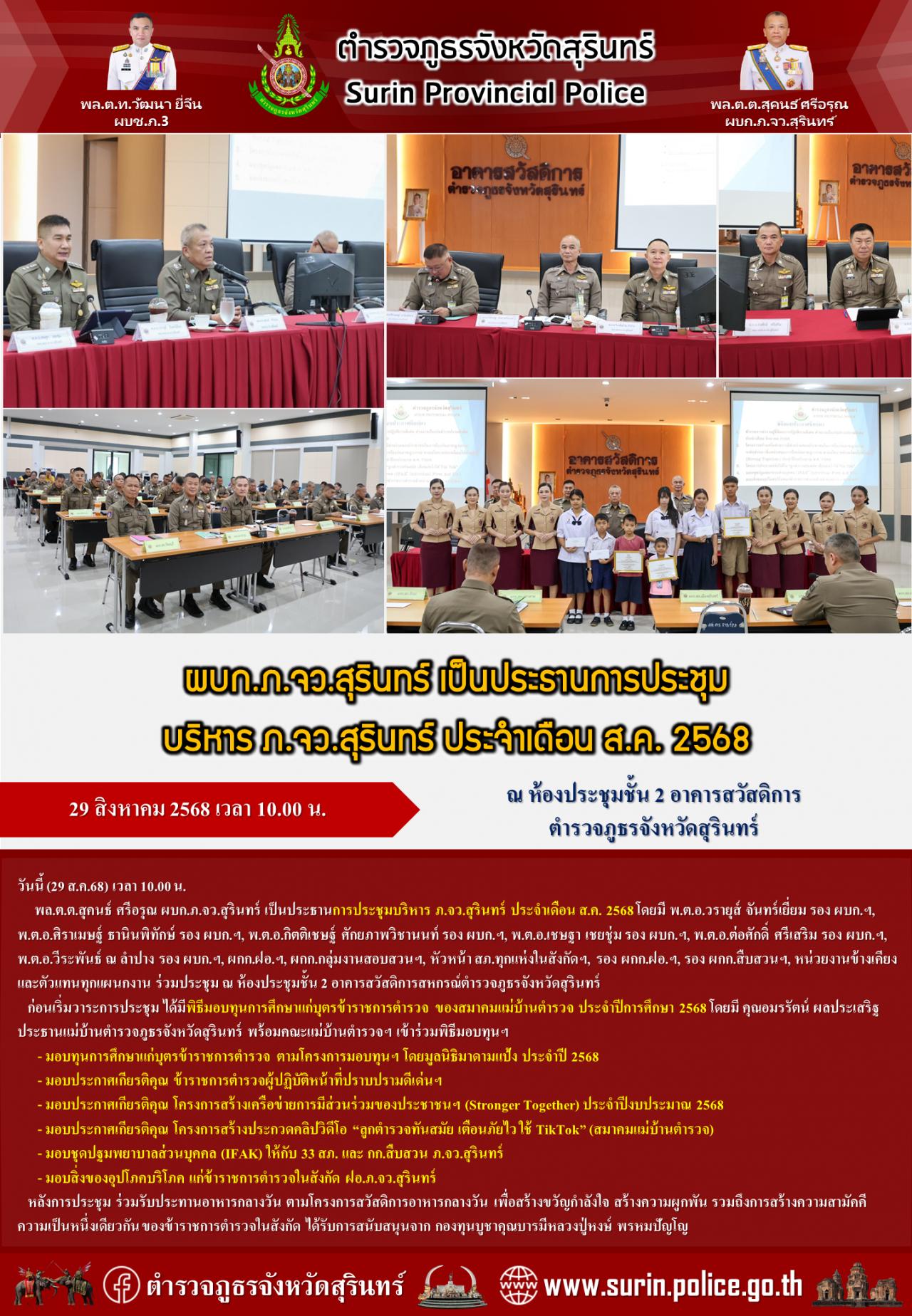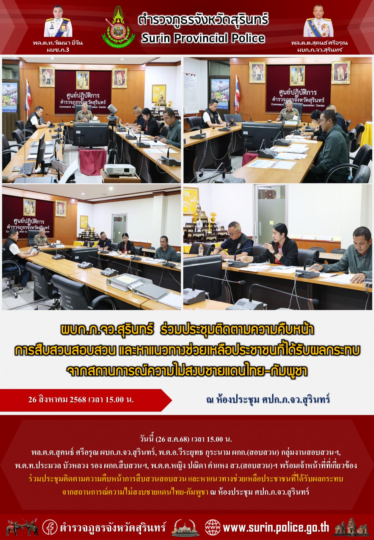 26 ส.ค. 2568 16:45:37 ประชุมติดตามความคืบหน้าการสืบสวนสอบสวน และหาแนวทางช่วยเหลือประชาชนที่ได้รับผลกระทบจากสถานการณ์ความไม่สงบชายแดนไทย-กัมพูชา วันนี้ (26 ส.ค.68) เวลา 15.00 น. พล.ต.ต.สุคนธ์ ศรีอรุณ ผบก.ภ.จว.สุรินทร์, พ.ต.อ.วีระยุทธ กุระนาม ผกก.(สอบสวน) กลุ่มงานสอบสวนฯ, พ.ต.ท.ประมวล บัวหลวง รอง ผกก.สืบสวนฯ, พ.ต.ต.หญิง...