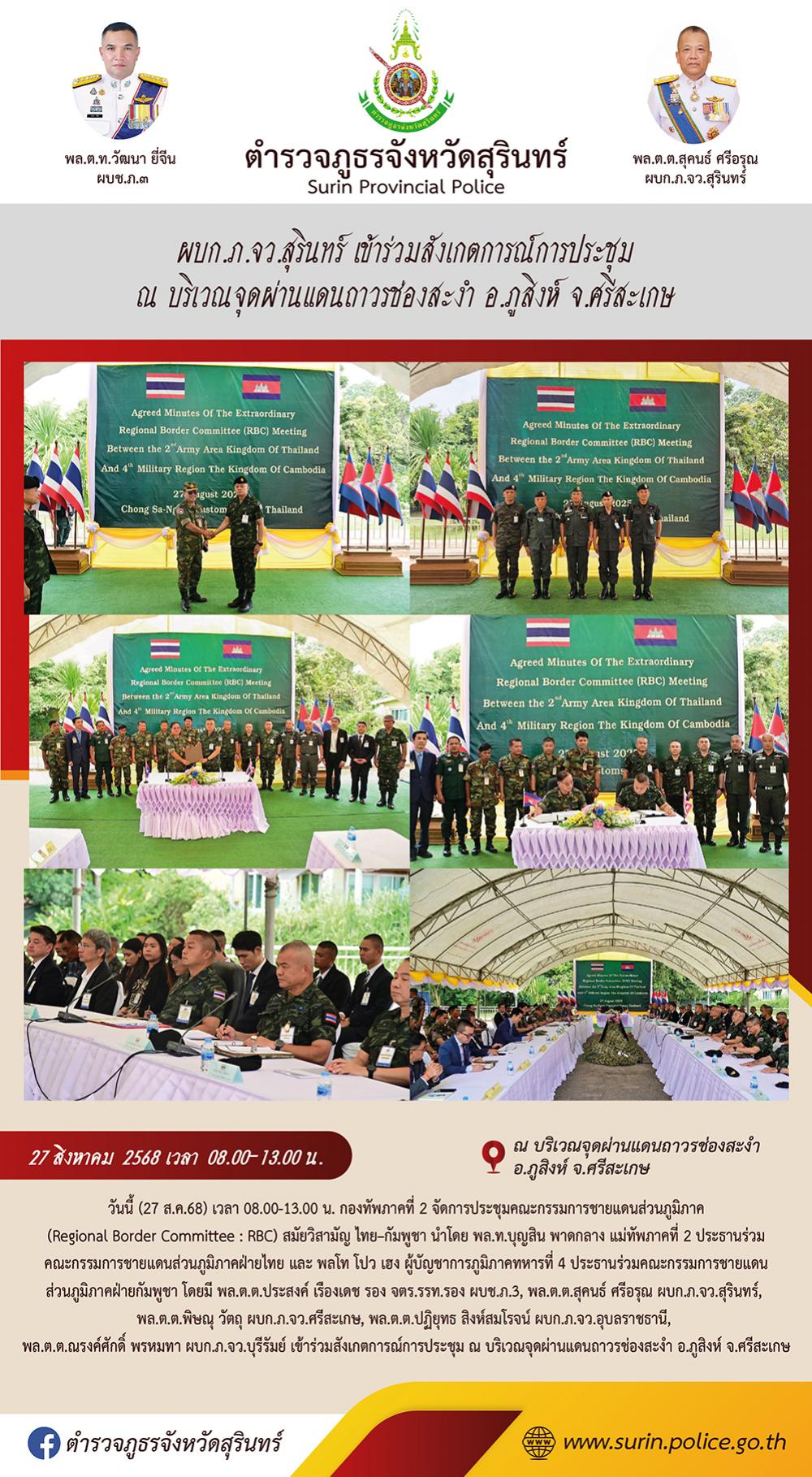 27 ส.ค. 2568 15:56:07ผบก.ภ.จว.สุรินทร์ เข้าร่วมสังเกตการณ์การประชุม ณ บริเวณจุดผ่านแดนถาวรช่องสะงำ อ.ภูสิงห์ จ.ศรีสะเกษ วันนี้ (27 ส.ค.68) เวลา 08.00-13.00 น. กองทัพภาคที่ 2 จัดการประชุมคณะกรรมการชายแดนส่วนภูมิภาค (Regional Border Committee : RBC) สมัยวิสามัญ ไทย–กัมพูชา นำโดย พล.ท.บุญสิน พาดกลาง แม่ทัพภาคที่ 2 ประธา...