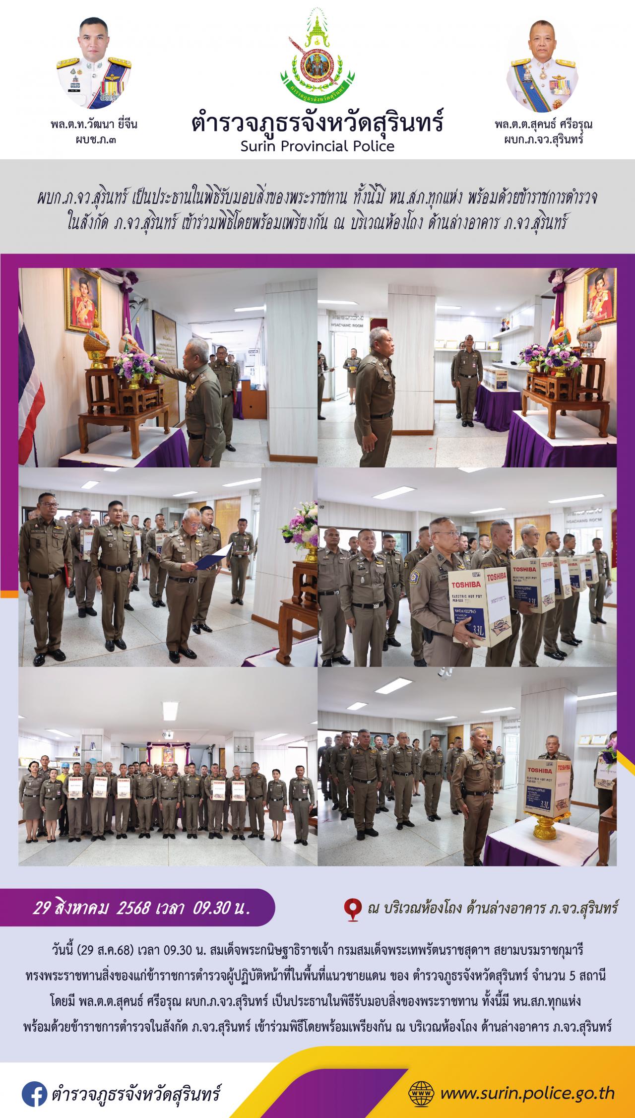 29 ส.ค. 2568 12:40:52ผบก.ภ.จว.สุรินทร์ เป็นประธานในพิธีรับมอบสิ่งของพระราชทาน ทั้งนี้มี หน.สภ.ทุกแห่ง พร้อมด้วยข้าราชการตำรวจ ในสังกัด ภ.จว.สุรินทร์ เข้าร่วมพิธีโดยพร้อมเพรียงกัน ณ บริเวณห้องโถง ด้านล่างอาคาร ภ.จว.สุรินทร์ วันนี้ (29 ส.ค.68) เวลา 09.30 น. สมเด็จพระกนิษฐาธิราชเจ้า กรมสมเด็จพระเทพรัตนราชสุดาฯ สยามบรมราชก...
