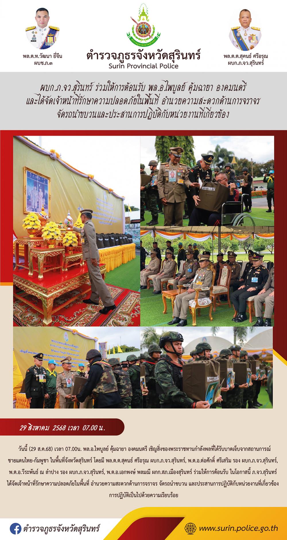 29 ส.ค. 2568 13:33:28ผบก.ภ.จว.สุรินทร์ ร่วมให้การต้อนรับ พล.อ.ไพบูลย์ คุ้มฉายา องคมนตรี และได้จัดเจ้าหน้าที่รักษาความปลอดภัยในพื้นที่ อำนวยความสะดวกด้านการจราจร จัดรถนำขบวนและประสานการปฏิบัติกับหน่วยงานที่เกี่ยวข้อง วันนี้ (29 ส.ค.68) เวลา 07.00น. พล.อ.ไพบูลย์ คุ้มฉายา องคมนตรี เชิญสิ่งของพระราชทานกำลังพลที่ได้รับบาดเ...