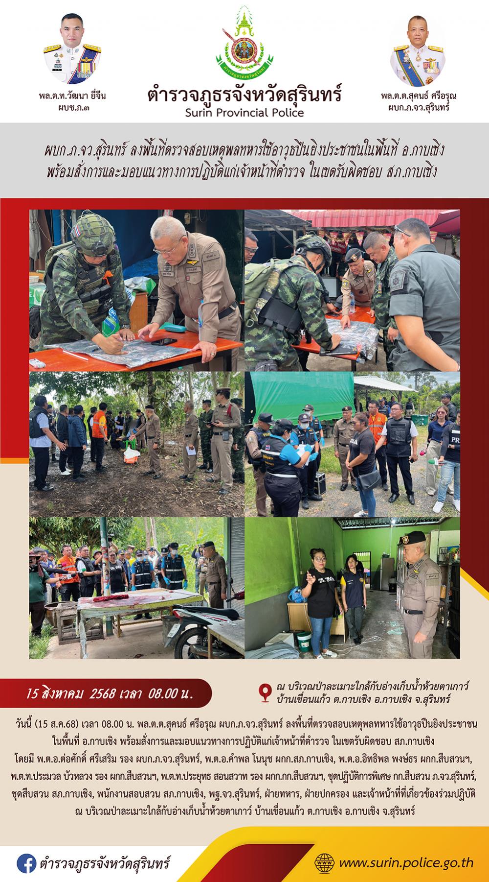 15 ส.ค. 2568 15:44:38ผบก.ภ.จว.สุรินทร์ ลงพื้นที่ตรวจสอบเหตุพลทหารใช้อาวุธปืนยิงประชาชนในพื้นที่ อ.กาบเชิง พร้อมสั่งการและมอบแนวทางการปฏิบัติแก่เจ้าหน้าที่ตำรวจ ในเขตรับผิดชอบ สภ.กาบเชิง วันนี้ (15 ส.ค.68) เวลา 08.00 น. พล.ต.ต.สุคนธ์ ศรีอรุณ ผบก.ภ.จว.สุรินทร์ ลงพื้นที่ตรวจสอบเหตุพลทหารใช้อาวุธปืนยิงประชาชน ในพื้นที่ อ...