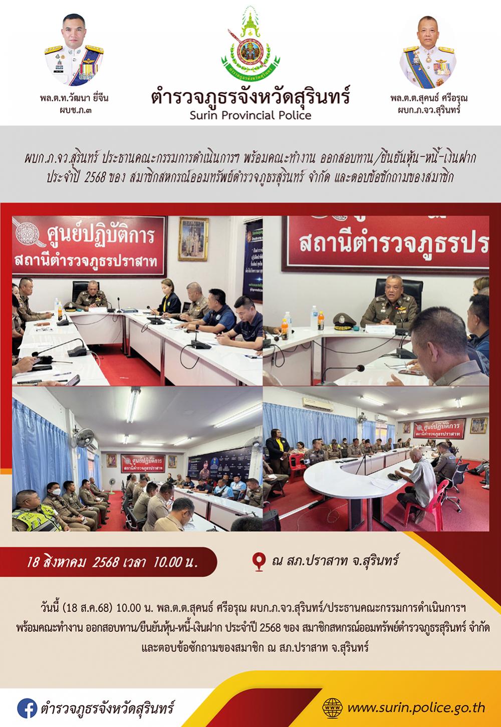 18 ส.ค. 2568 15:42:46ผบก.ภ.จว.สุรินทร์ ประธานคณะกรรมการดำเนินการฯ พร้อมคณะทำงาน ออกสอบทาน/ยืนยันหุ้น-หนี้-เงินฝาก ประจำปี 2568 ของ สมาชิกสหกรณ์ออมทรัพย์ตำรวจภูธรสุรินทร์ จำกัด และตอบข้อซักถามของสมาชิก วันนี้ (18 ส.ค.68) 10.00 น. พล.ต.ต.สุคนธ์ ศรีอรุณ ผบก.ภ.จว.สุรินทร์/ประธานคณะกรรมการดำเนินการฯ พร้อมคณะทำงาน ออกสอบทาน...