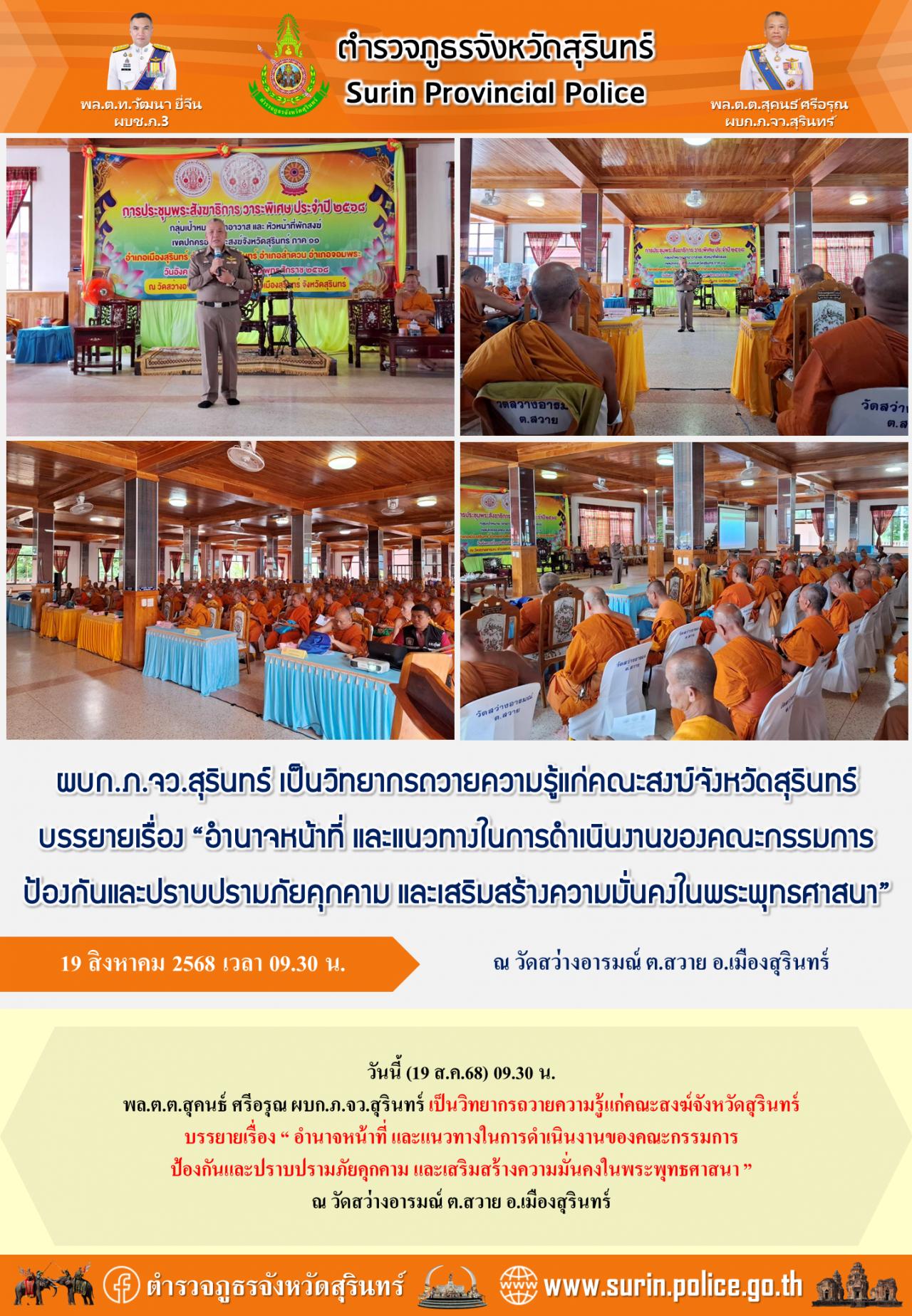 19 ส.ค. 2568 17:29:28 วันนี้ (19 ส.ค.68) 09.30 น. พล.ต.ต.สุคนธ์ ศรีอรุณ ผบก.ภ.จว.สุรินทร์ เป็นวิทยากรถวายความรู้แก่คณะสงฆ์จังหวัดสุรินทร์ บรรยายเรื่อง “อำนาจหน้าที่ และแนวทางในการดำเนินงานของคณะกรรมการป้องกันและปราบปรามภัยคุกคาม และเสริมสร้างความมั่นคงในพระพุทธศาสนา” ณ วัดสว่างอารมณ์ ต.สวาย อ.เมืองสุรินทร์ ...
