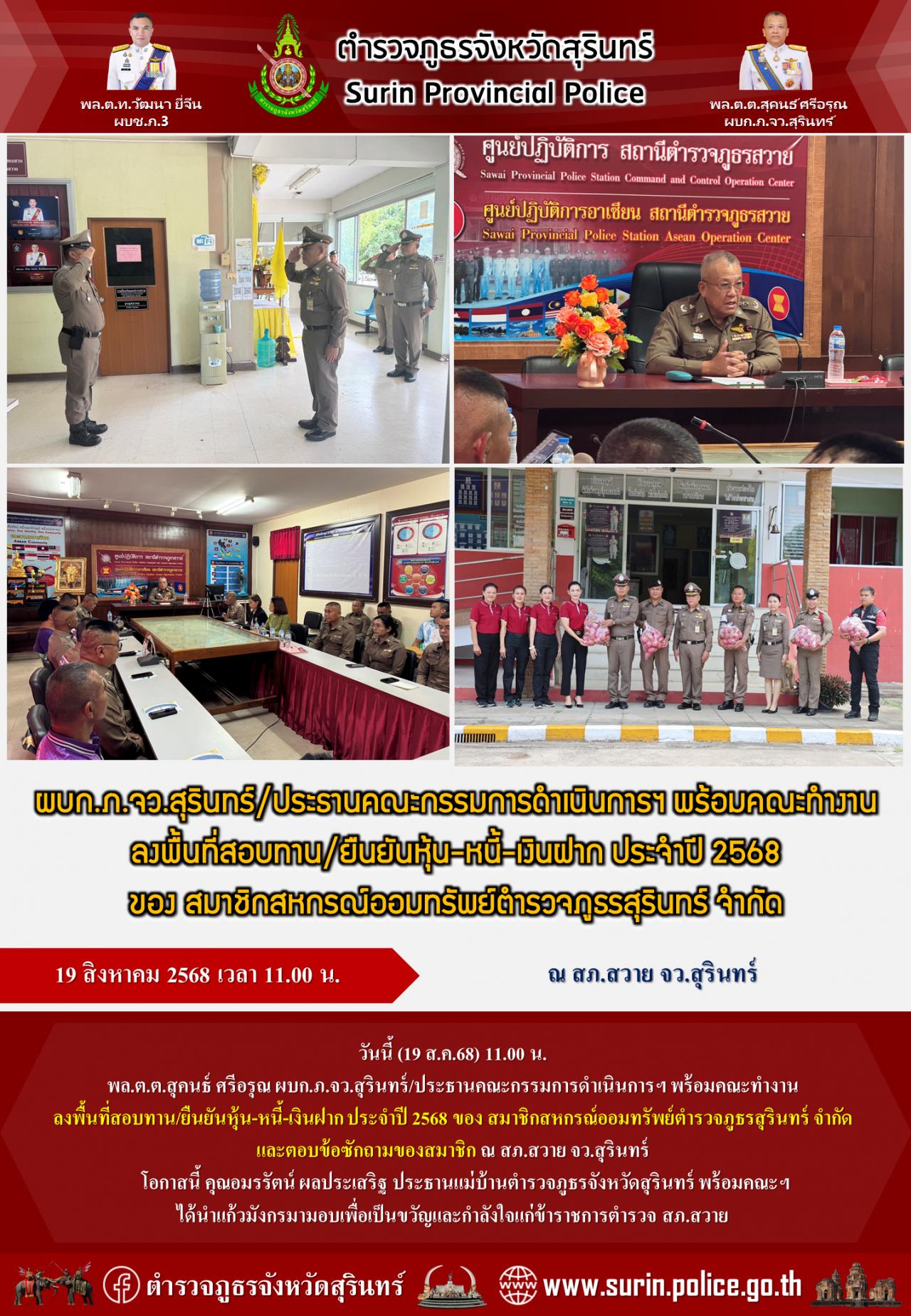 19 ส.ค. 2568 17:29:33 วันนี้ (19 ส.ค.68) 11.00 น. พล.ต.ต.สุคนธ์ ศรีอรุณ ผบก.ภ.จว.สุรินทร์/ประธานคณะกรรมการดำเนินการฯ พร้อมคณะทำงาน ลงพื้นที่สอบทาน/ยืนยันหุ้น-หนี้-เงินฝาก ประจำปี 2568 ของ สมาชิกสหกรณ์ออมทรัพย์ตำรวจภูธรสุรินทร์ จำกัด และตอบข้อซักถามของสมาชิก ณ สภ.สวาย จว.สุรินทร์ โอกาสนี้ คุณอมรรัตน์ ผลประเสริฐ ประ...