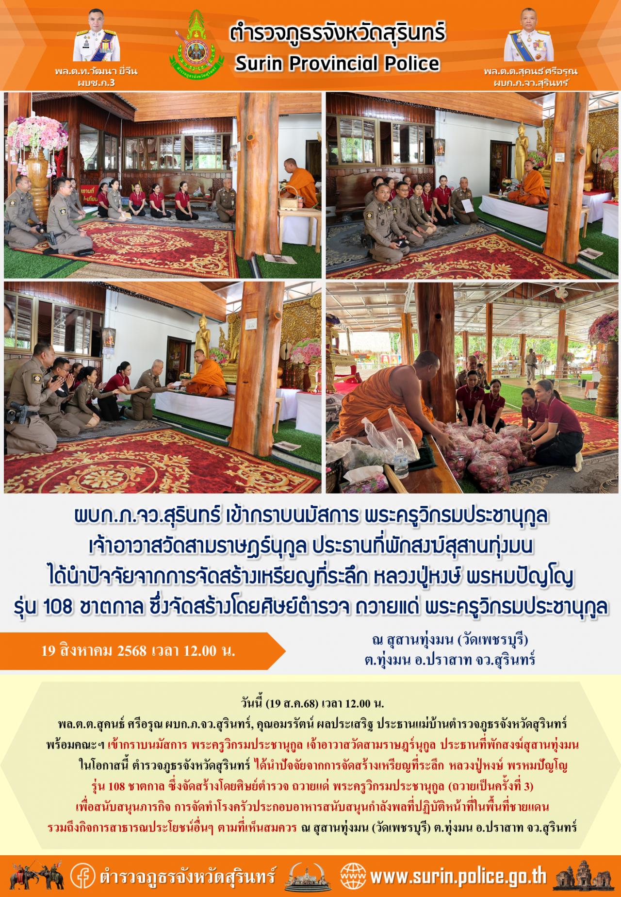 19 ส.ค. 2568 17:29:39วันนี้ (19 ส.ค.68) เวลา 12.00 น. พล.ต.ต.สุคนธ์ ศรีอรุณ ผบก.ภ.จว.สุรินทร์, คุณอมรรัตน์ ผลประเสริฐ ประธานแม่บ้านตำรวจภูธรจังหวัดสุรินทร์ พร้อมคณะฯ เข้ากราบนมัสการ พระครูวิกรมประชานุกูล เจ้าอาวาสวัดสามราษฎร์นุกูล ประธานที่พักสงฆ์สุสานทุ่งมน ในโอกาสนี้ ตำรวจภูธรจังหวัดสุรินทร์ ได้นำปัจจัยจากการ...
