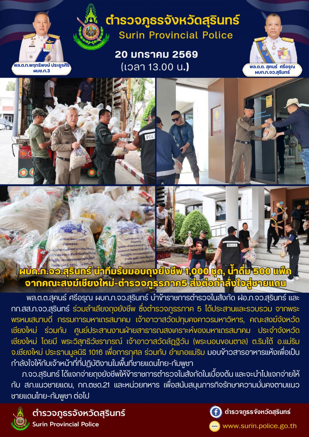 21 ม.ค. 2569 12:49:43มอบถุงยังชีพจำนวน 1,000 ชุด พร้อมน้ำดื่ม 500 แพ็ค จากตำรวจภูธรภาค 5 ซึ่งได้ประสานและรวบรวมจาก พระพรหมเสนาบดี กรรมการมหาเถรสมาคม เจ้าอาวาสวัดปทุมคงคาวรมหาวิหาร, คณะสงฆ์จังหวัดเชียงใหม่ ร่วมกับ ศูนย์ประสานงานฝ่ายสาธารณสงเคราะห์ของมหาเถรสมาคม ประจำจังหวัดเชียงใหม่ วันที่ 20 ม.ค.69 เวลา 13.00 น. พล.ต.ต...