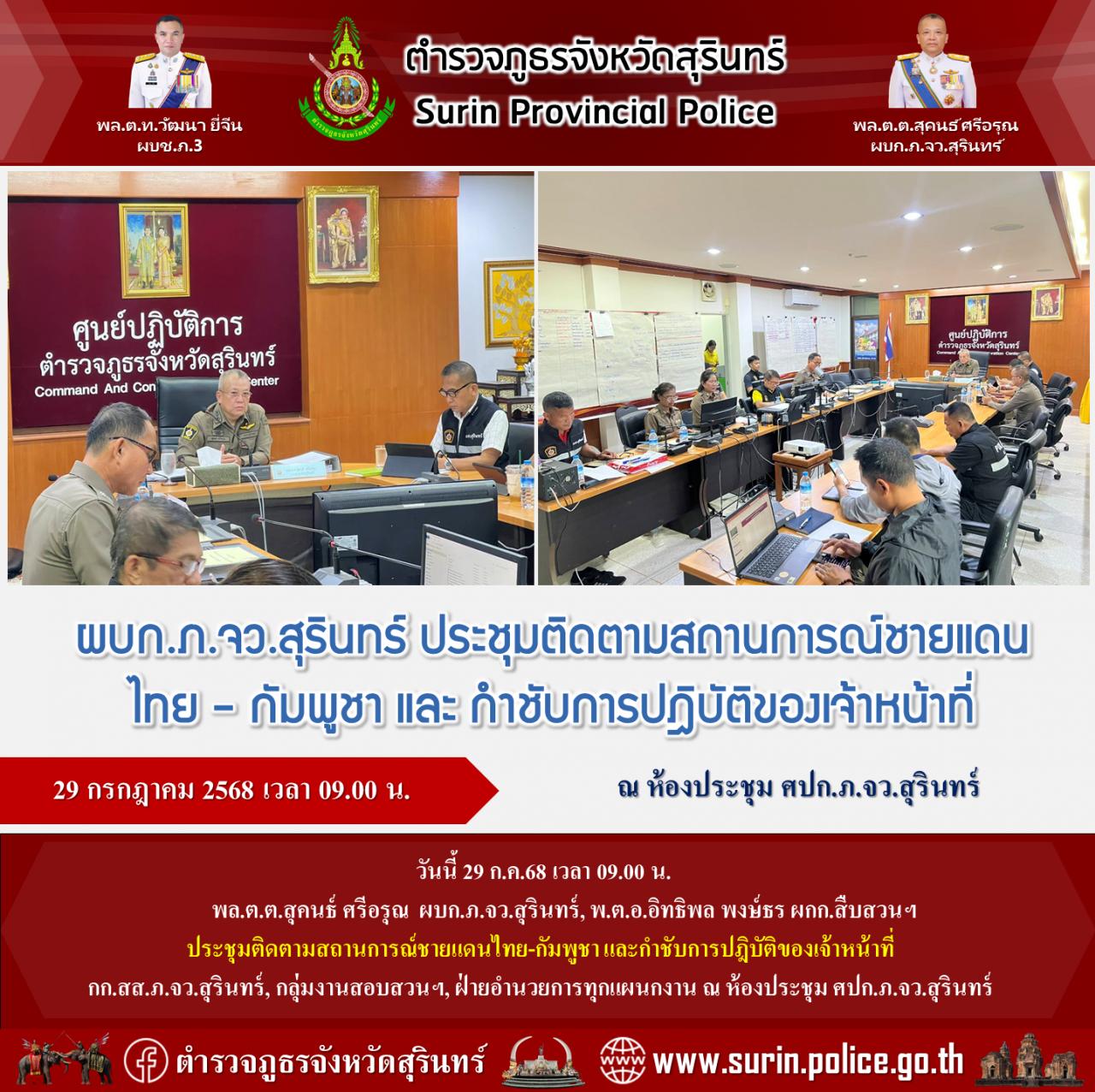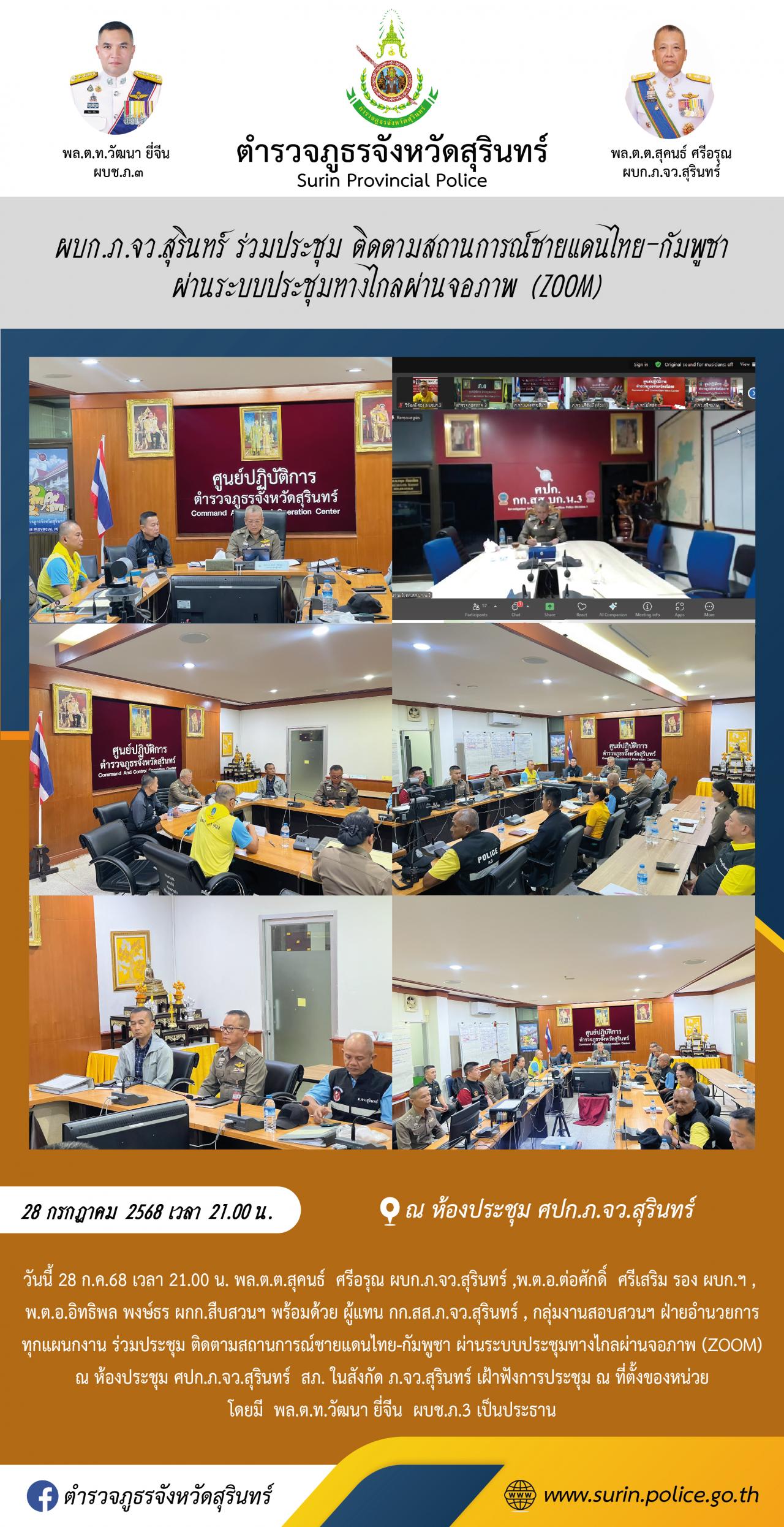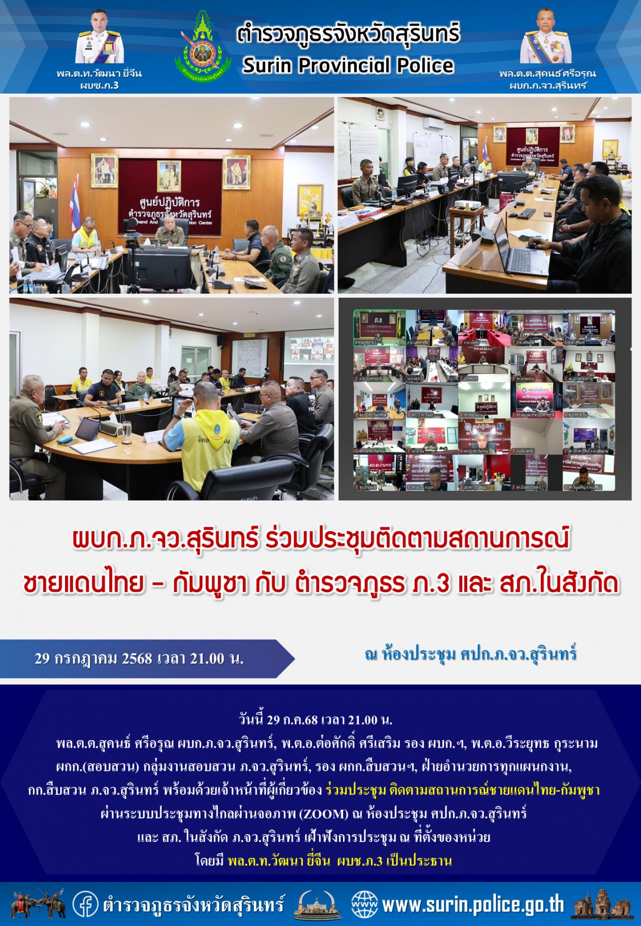 4 ส.ค. 2568 11:33:33 วันนี้ 29 ก.ค.68 เวลา 11.30 น. พล.ต.ต.สุคนธ์ ศรีอรุณ ผบก.ภ.จว.สุรินทร์ ,พ.ต.อ.ต่อศักดิ์ ศรีเสริม รอง ผบก.ฯ พร้อมด้วยเจ้าหน้าที่ประจำ ศปก.ฯ ร่วมประชุมรายงานสถานการณ์รายวันที่เกิดขึ้นภายในพื้นที่ ที่มีผลกระทบจากสถานการณ์ชายแดนไทย-กัมพูชา ผ่านระบบประชุมทางไกลผ่านจอภาพ ณ ห้องประชุม ศปก.ภ.จ...