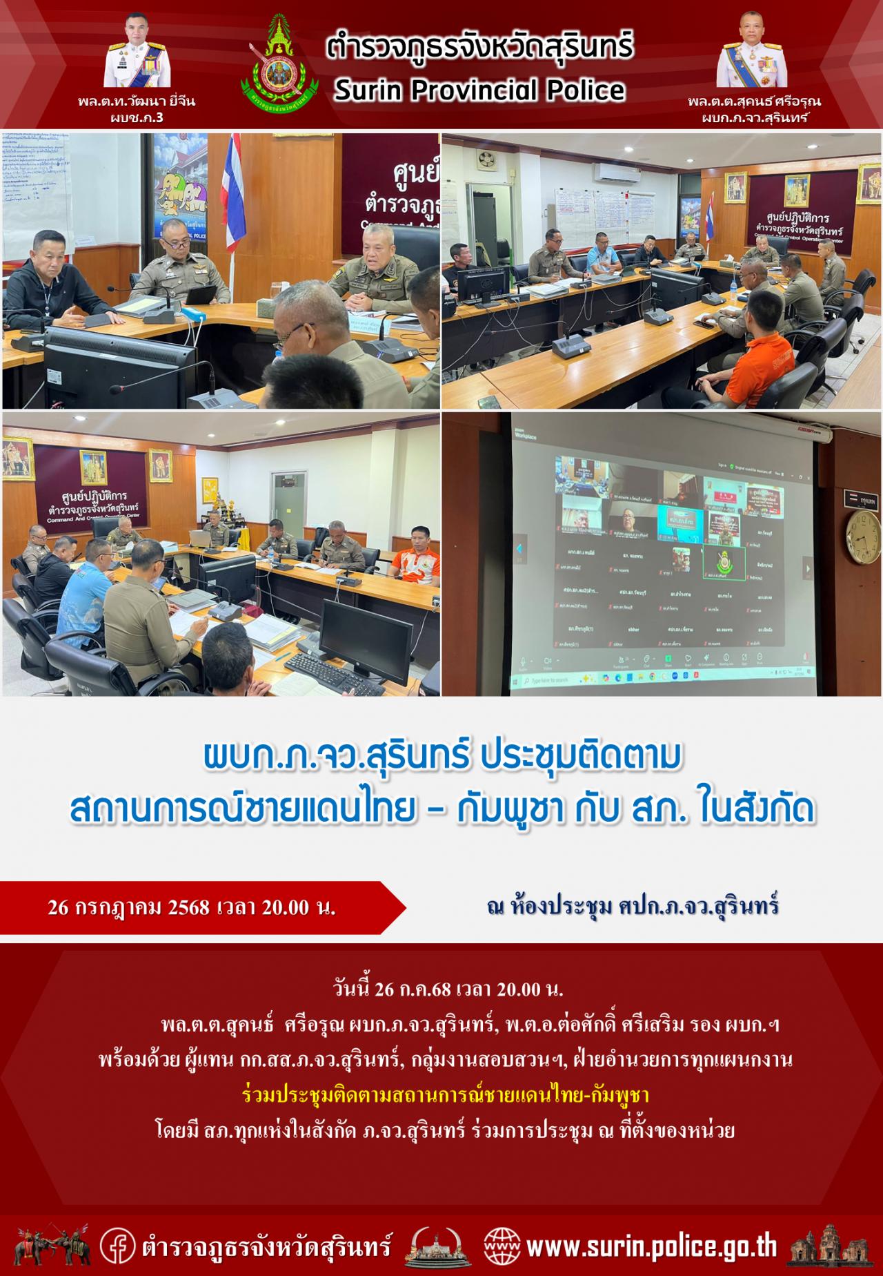 26 ก.ค. 2568 22:58:46ประชุมติดตามสถานการณ์ชายแดนไทย-กัมพูชา วันนี้ 27 ก.ค.68 เวลา 09.30 น. พล.ต.ต.สุคนธ์ ศรีอรุณ ผบก.ภ.จว.สุรินทร์ , พ.ต.อ.วีระพันธ์ ณ ลำปาง รอง ผบก.ฯ ,พ.ต.อ.อิทธิพล พงษ์ธร ผกก.สืบสวนฯ พร้อมด้วย ผู้แทน กก.สส.ภ.จว.สุรินทร์ , กลุ่มงานสอบสวนฯ ฝ่ายอำนวยการทุกแผนกงาน ร่วมประชุมติดตามสถานการณ์ชา...