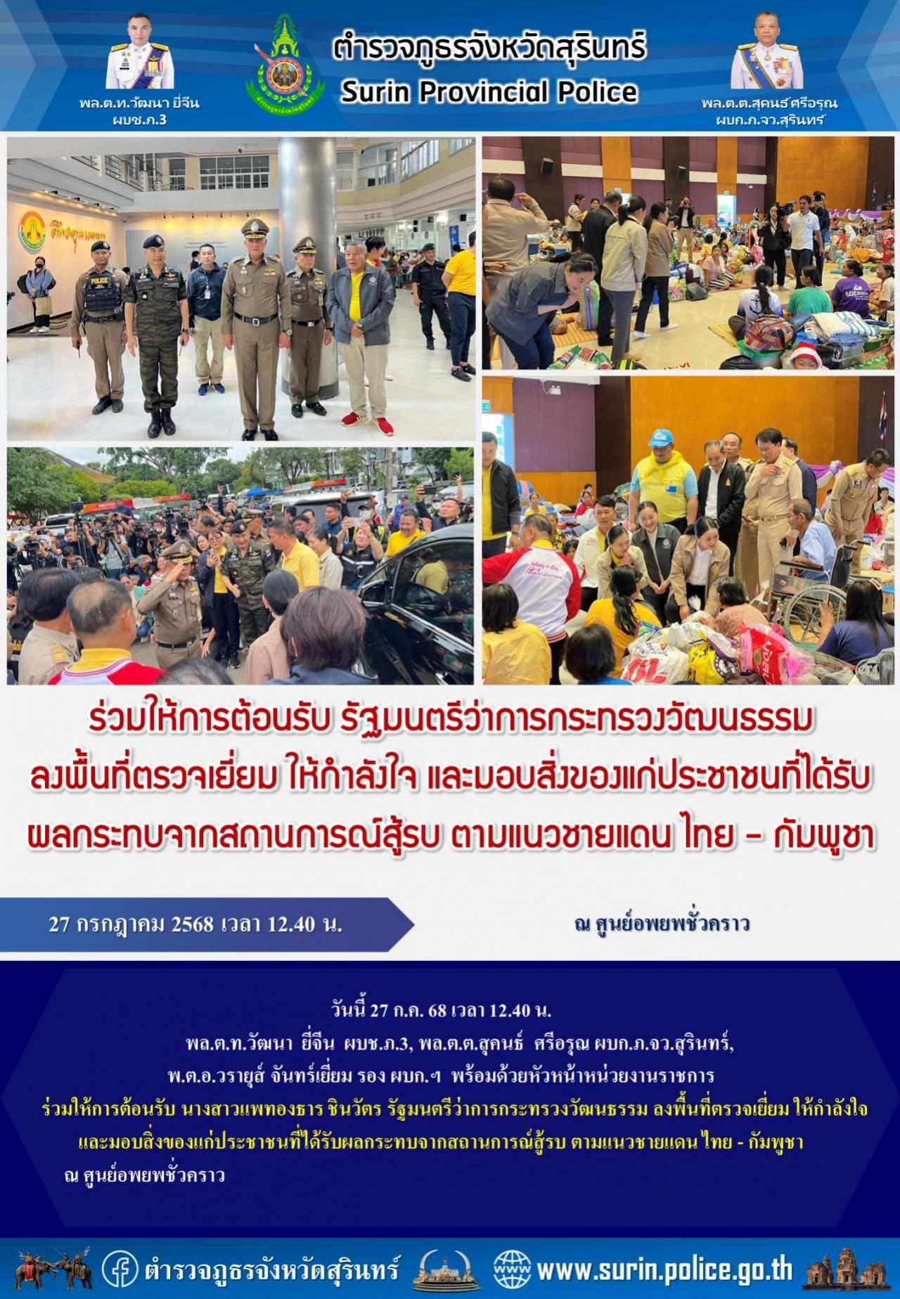 27 ก.ค. 2568 14:17:57ร่วมให้การต้อนรับ รัฐมนตรีว่าการกระทรวงวัฒนธรรม ลงพื้นที่ตรวจเยี่ยม ให้กำลังใจ และมอบสิ่งของแก่ประชาชนที่ได้รับผลกระทบจากสถานการณ์สู้รบ ตามแนวชายแดน ไทย - กัมพูชา วันนี้ 24 ก.ค. 68 เวลา 12.40 น. พล.ต.ท.วัฒนา ยี่จีน ผบช.ภ.3 , พล.ต.ต.สุคนธ์ ศรีอรุณ ผบก.ภ.จว.สุรินทร์ , พ.ต.อ.วรายุส์ จันทร...