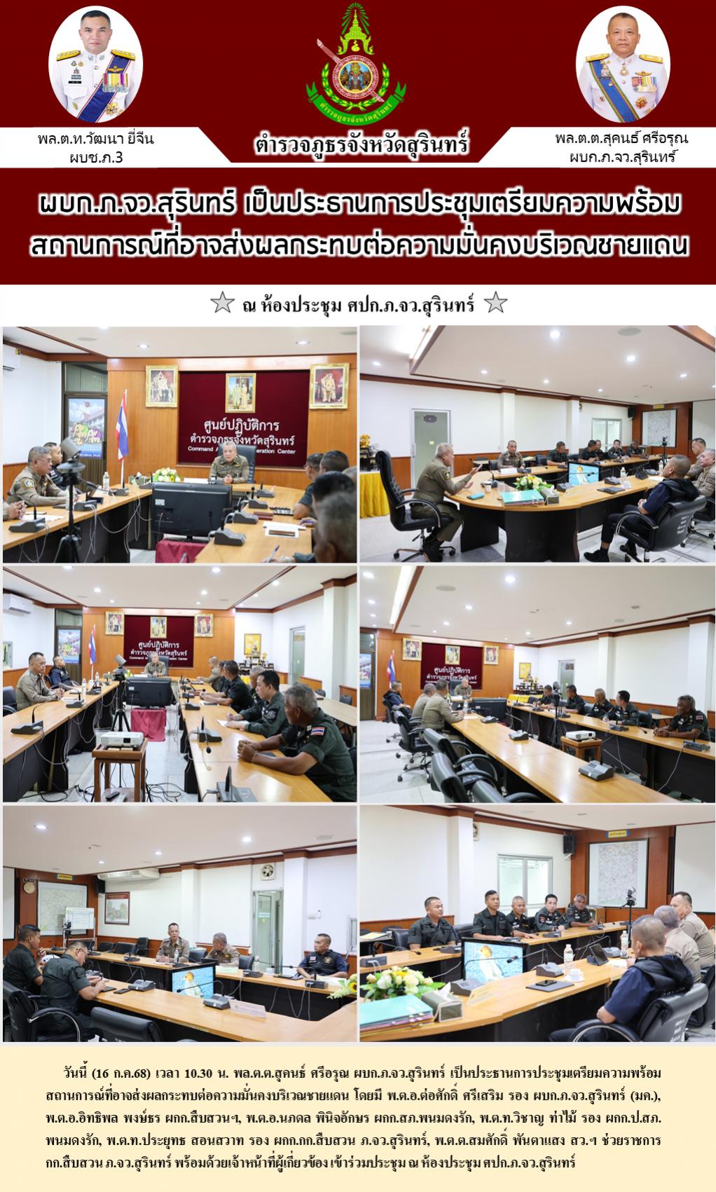17 ก.ค. 2568 10:47:04 วันนี้ (16 ก.ค.68) เวลา 10.30 น. พล.ต.ต.สุคนธ์ ศรีอรุณ ผบก.ภ.จว.สุรินทร์ เป็นประธานการประชุมเตรียมความพร้อมสถานการณ์ที่อาจส่งผลกระทบต่อความมั่นคงบริเวณชายแดน โดยมี พ.ต.อ.ต่อศักดิ์ ศรีเสริม รอง ผบก.ภ.จว.สุรินทร์ (มค.), พ.ต.อ.อิทธิพล พงษ์ธร ผกก.สืบสวนฯ, พ.ต.อ.นพดล พินิจอักษร ผกก.สภ.พนมดงรัก, พ.ต.ท.วิ...