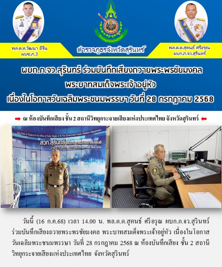 17 ก.ค. 2568 10:47:09 วันนี้ (16 ก.ค.68) เวลา 14.00 น. พล.ต.ต.สุคนธ์ ศรีอรุณ ผบก.ภ.จว.สุรินทร์ ร่วมบันทึกเสียงถวายพระพรชัยมงคล พระบาทสมเด็จพระเจ้าอยู่หัว เนื่องในโอกาสวันเฉลิมพระชนมพรรษา วันที่ 28 กรกฎาคม 2568 ณ ห้องบันทึกเสียง ชั้น 2 สถานีวิทยุกระจายเสียงแห่งประเทศไทย จังหวัดสุรินทร์...