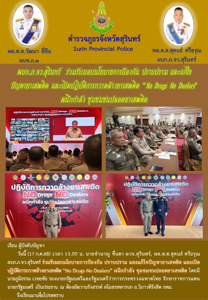 17 ก.ค. 2568 16:17:31ผบก.ภ.จว.สุรินทร์ ร่วมรับมอบนโยบายการป้องกัน ปราบปราม และแก้ไขปัญหายาเสพติด และเปิดปฏิบัติการกวาดล้างยาเสพติด "No Drugs No Dealers" ผนึกกำลัง ชุมชมชนปลอดยาเสพติด โดยมี นายภูมิธรรม เวชยชัย รองนายกรัฐมนตรีและรัฐมนตรีว่าการกระทรวงมหาดไทย รักษาราชการแทนนายกรัฐมนตรี เป็นประธาน ณ ห้องมัฆวานรังสรรค์ สโมสรท...