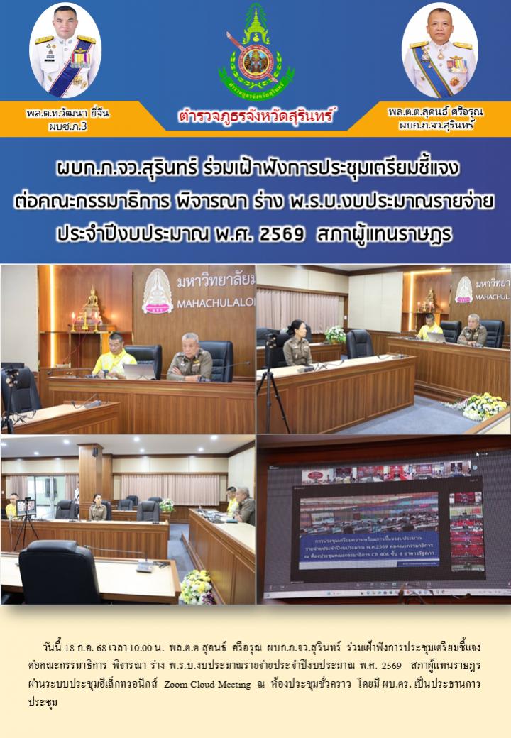 18 ก.ค. 2568 13:59:55 วันนี้ 18 ก.ค. 68 เวลา 10.00 น. พล.ต.ต สุคนธ์ ศรีอรุณ ผบก.ภ.จว.สุรินทร์ ร่วมเฝ้าฟังการประชุมเตรียมชี้แจง ต่อคณะกรรมาธิการ พิจารณา ร่าง พ.ร.บ.งบประมาณรายจ่ายประจำปีงบประมาณ พ.ศ. 2569 สภาผู้แทนราษฎร ผ่านระบบประชุมอิเล็กทรอนิกส์ Zoom Cloud Meeting ณ ห้องประชุมชั่วคราว โดยมี ผบ.ตร. เป็นปร...