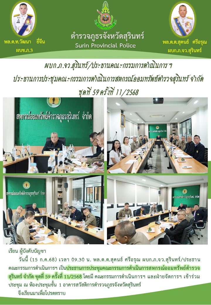 15 ก.ค. 2568 15:28:46ผบก.ภ.จว.สุรินทร์/ประธานคณะกรรมการดำเนินการฯ เป็นประธานการประชุมคณะกรรมการดำเนินการสหกรณ์ออมทรัพย์ตำรวจสุรินทร์ จำกัด ชุดที่ 59 ครั้งที่ 11/2568 โดยมี คณะกรรมการดำเนินการฯ และฝ่ายจัดการฯ เข้าร่วมประชุม ณ ห้องประชุมชั้น 1 อาคารสวัสดิการตำรวจภูธรจังหวัดสุรินทร์...