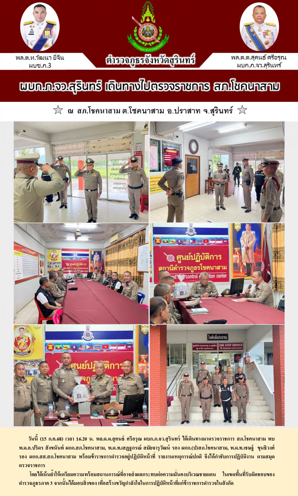 15 ก.ค. 2568 18:37:26ผบก.ภ.จว.สุรินทร์ เดินทางไปตรวจราชการ สภ.โชคนาสาม วันนี้ (15 ก.ค.68) เวลา 16.20 น. พล.ต.ต.สุคนธ์ ศรีอรุณ ผบก.ภ.จว.สุรินทร์ ได้เดินทางมาตรวจราชการ สภ.โชคนาสาม พบ พ.ต.อ.ปริตร สังขนันท์ ผกก.สภ.โชคนาสาม, พ.ต.ท.เสฏฐกรณ์ สมัยจารุวัฒน์ รอง ผกก.(ป)สภ.โชคนาสาม, พ.ต.ท.เชษฐ์ ขุนธิวงศ์ รอง ผกก.สส.สภ.โ...