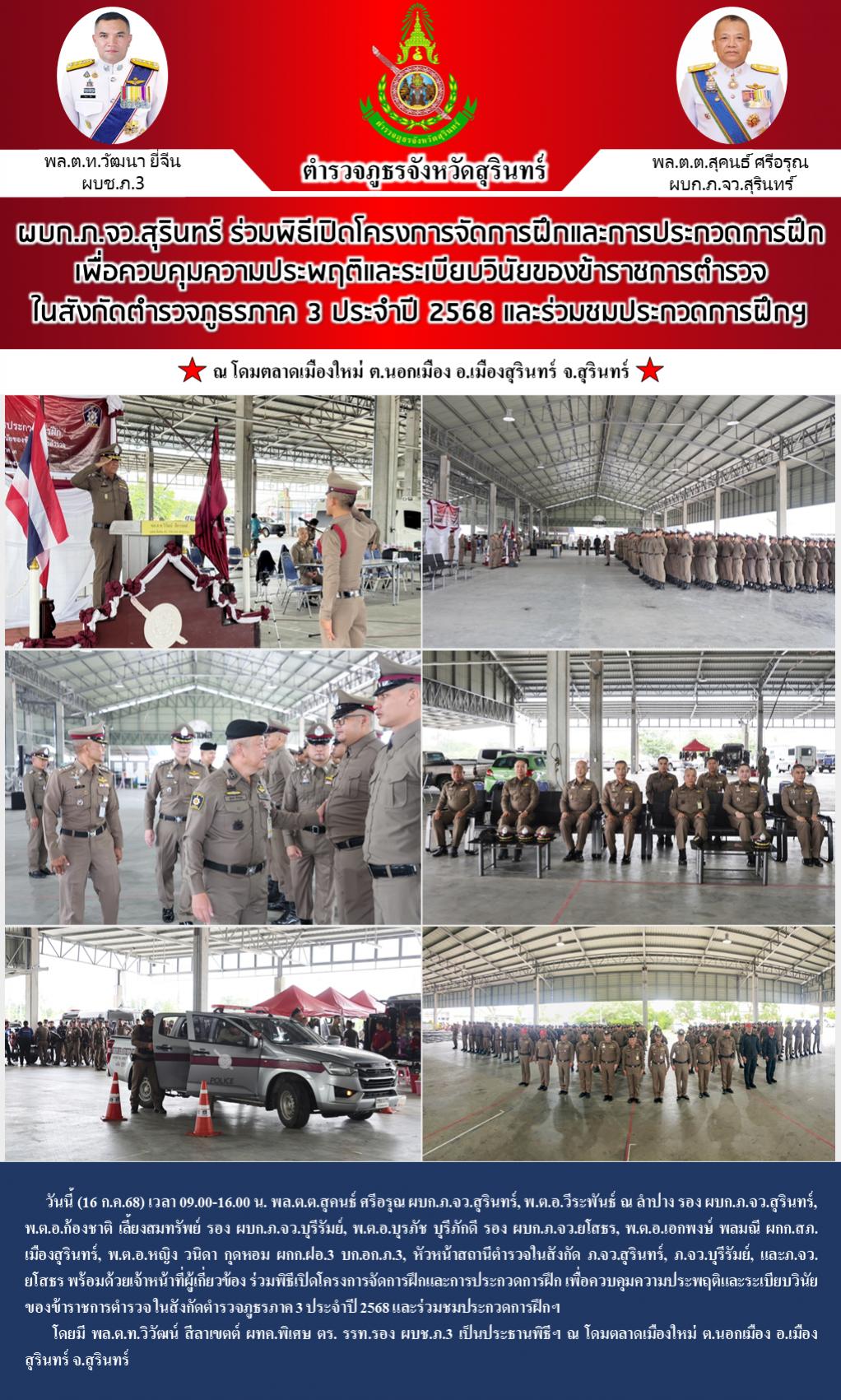 17 ก.ค. 2568 10:46:58ผบก.ภ.จว.สุรินทร์ ร่วมพิธีเปิดโครงการจัดการฝึกและการประกวดการฝึก เพื่อควบคุมความประพฤติและระเบียบวินัยของข้าราชการตำรวจ ในสังกัดตำรวจภูธรภาค 3 ประจำปี 2568 และร่วมชมประกวดการฝึกฯ วันนี้ (16 ก.ค.68) เวลา 09.00-16.00 น. พล.ต.ต.สุคนธ์ ศรีอรุณ ผบก.ภ.จว.สุรินทร์, พ.ต.อ.วีระพันธ์ ณ ลำปาง รอง ผบก.ภ.จว.ส...