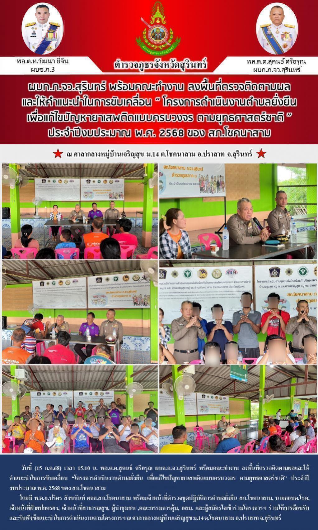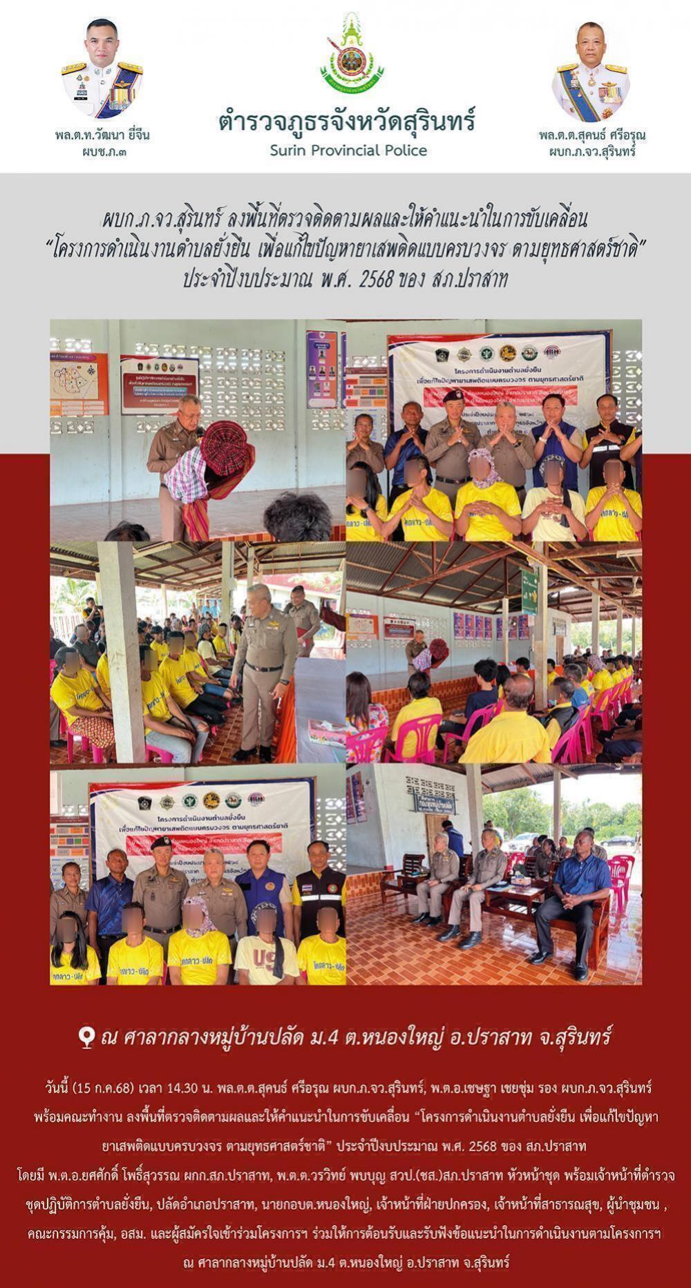 15 ก.ค. 2568 15:38:14ผบก.ภ.จว.สุรินทร์ ลงพื้นที่ตรวจติดตามผลและให้คำแนะนำในการขับเคลื่อน “โครงการดำเนินงานตำบลยั่งยืน เพื่อแก้ไขปัญหายาเสพติดแบบครบวงจร ตามยุทธศาสตร์ชาติ” ประจำปีงบประมาณ พ.ศ. 2568 ของ สภ.ปราสาท วันนี้ (15 ก.ค.68) เวลา 14.30 น. พล.ต.ต.สุคนธ์ ศรีอรุณ ผบก.ภ.จว.สุรินทร์, พ.ต.อ.เชษฐา เชยชุ่ม รอง ผบก.ภ.จว....