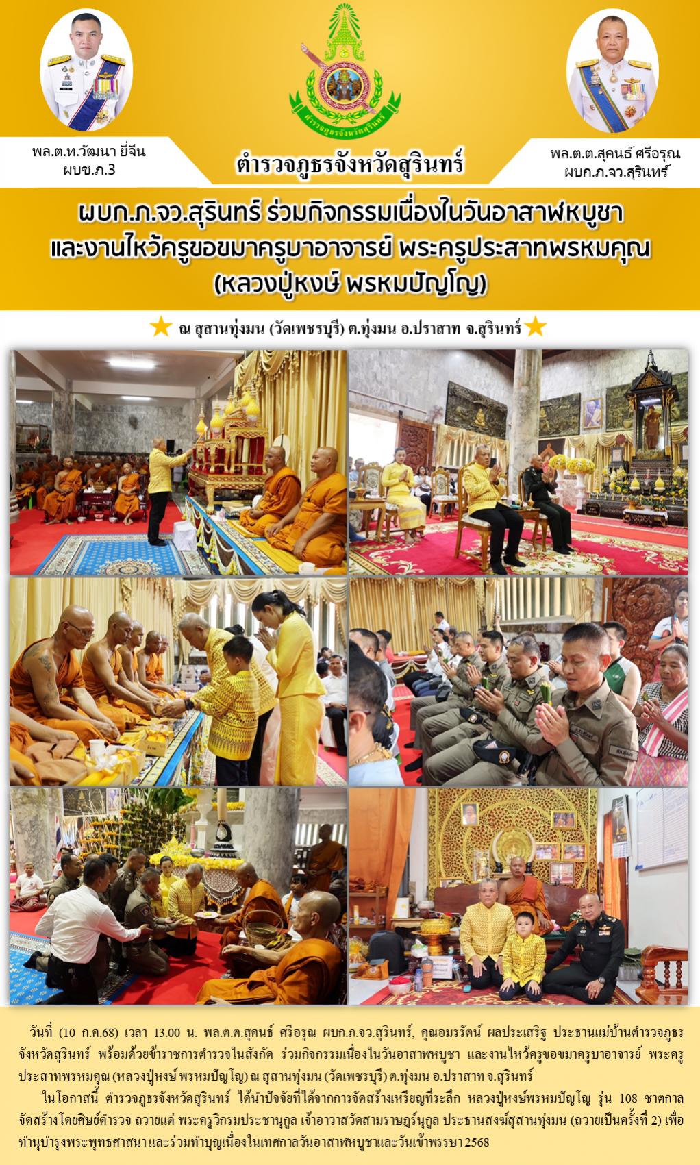 11 ก.ค. 2568 13:05:13ผบก.ภ.จว.สุรินทร์ ร่วมกิจกรรมเนื่องในวันอาสาฬหบูชา และงานไหว้ครูขอขมาครูบาอาจารย์ พระครูประสาทพรหมคุณ (หลวงปู่หงษ์ พรหมปัญโญ) วันที่ (10 ก.ค.68) เวลา 13.00 น. พล.ต.ต.สุคนธ์ ศรีอรุณ ผบก.ภ.จว.สุรินทร์, คุณอมรรัตน์ ผลประเสริฐ ประธานแม่บ้านตำรวจภูธรจังหวัดสุรินทร์ พร้อมด้วยข้าราชการตำรวจในสังกัด ร...