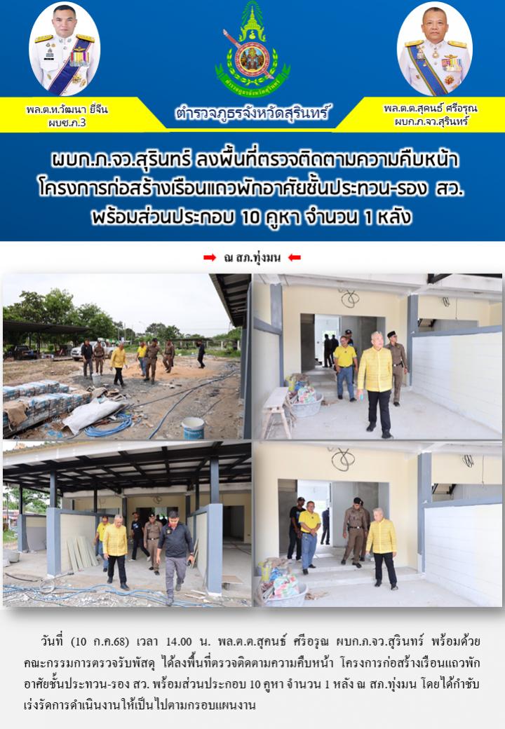 11 ก.ค. 2568 13:05:20 ผบก.ภ.จว.สุรินทร์ ลงพื้นที่ตรวจติดตามความคืบหน้า โครงการก่อสร้างเรือนแถวพักอาศัยชั้นประทวน-รอง สว. พร้อมส่วนประกอบ 10 คูหา จำนวน 1 หลัง วันที่ (10 ก.ค.68) เวลา 14.00 น. พล.ต.ต.สุคนธ์ ศรีอรุณ ผบก.ภ.จว.สุรินทร์ พร้อมด้วยคณะกรรมการตรวจรับพัสดุ ได้ลงพื้นที่ตรวจติดตามความคืบหน้า โครงการก่อสร้างเร...