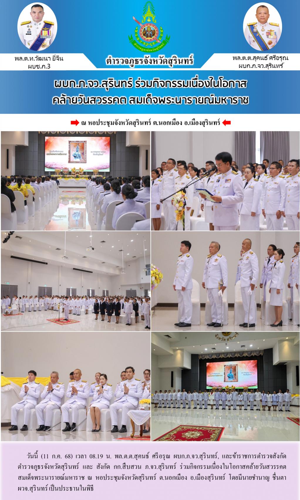 11 ก.ค. 2568 13:05:29ผบก.ภ.จว.สุรินทร์ ร่วมกิจกรรมเนื่องในโอกาสคล้ายวันสวรรคต สมเด็จพระนารายณ์มหาราช วันนี้ (11 ก.ค. 68) เวลา 08.19 น. พล.ต.ต.สุคนธ์ ศรีอรุณ ผบก.ภ.จว.สุรินทร์, และข้าราชการตำรวจสังกัดตำรวจภูธรจังหวัดสุรินทร์ และ สังกัด กก.สืบสวน ภ.จว.สุรินทร์ ร่วมกิจกรรมเนื่องในโอกาสคล้ายวันสวรรคต สมเด็จพระนารายณ์...