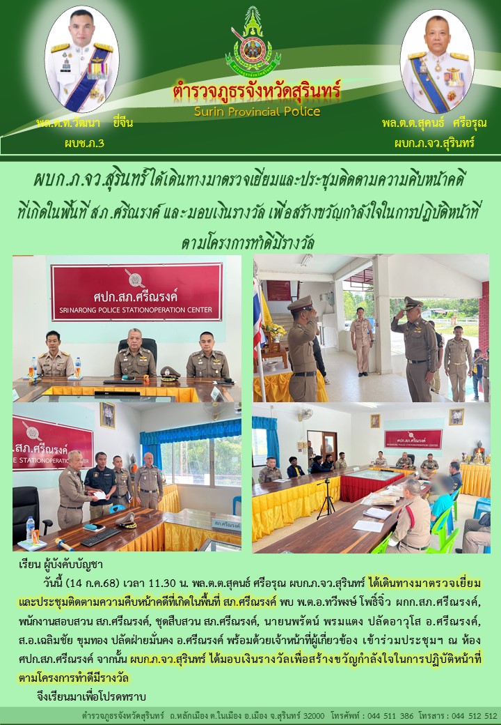 14 ก.ค. 2568 16:44:46วันนี้ (14 ก.ค.68) เวลา 11.30 น. พล.ต.ต.สุคนธ์ ศรีอรุณ ผบก.ภ.จว.สุรินทร์ ได้เดินทางมาตรวจเยี่ยมและประชุมติดตามความคืบหน้าคดีที่เกิดในพื้นที่ สภ.ศรีณรงค์ พบ พ.ต.อ.ทวีพงษ์ โพธิ์จิ๋ว ผกก.สภ.ศรีณรงค์, พนักงานสอบสวน สภ.ศรีณรงค์, ชุดสืบสวน สภ.ศรีณรงค์, นายนพรัตน์ พรมแตง ปลัดอาวุโส อ.ศรีณรงค์, ส.อ.เฉลิมชัย...