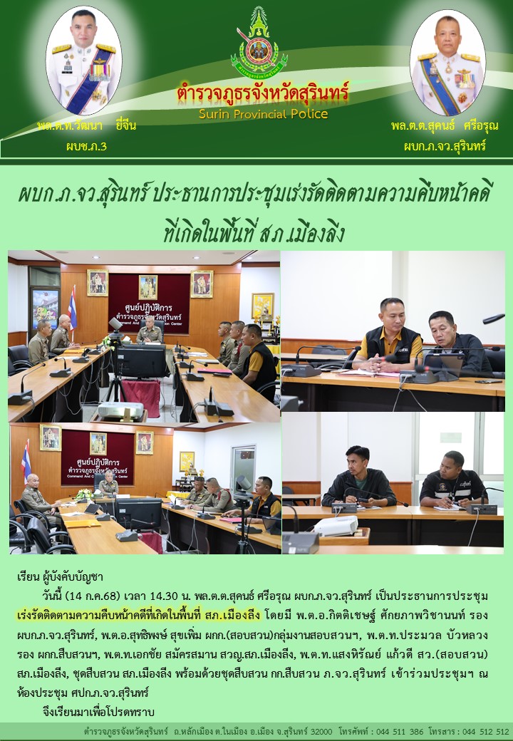 14 ก.ค. 2568 16:44:50วันนี้ (14 ก.ค.68) เวลา 14.30 น. พล.ต.ต.สุคนธ์ ศรีอรุณ ผบก.ภ.จว.สุรินทร์ เป็นประธานการประชุมเร่งรัดติดตามความคืบหน้าคดีที่เกิดในพื้นที่ สภ.เมืองลีง โดยมี พ.ต.อ.กิตติเชษฐ์ ศักยภาพวิชานนท์ รอง ผบก.ภ.จว.สุรินทร์, พ.ต.อ.สุทธิพงษ์ สุขเพิ่ม ผกก.(สอบสวน)กลุ่มงานสอบสวนฯ, พ.ต.ท.ประมวล บัวหลวง รอง ผกก.สืบสวนฯ...