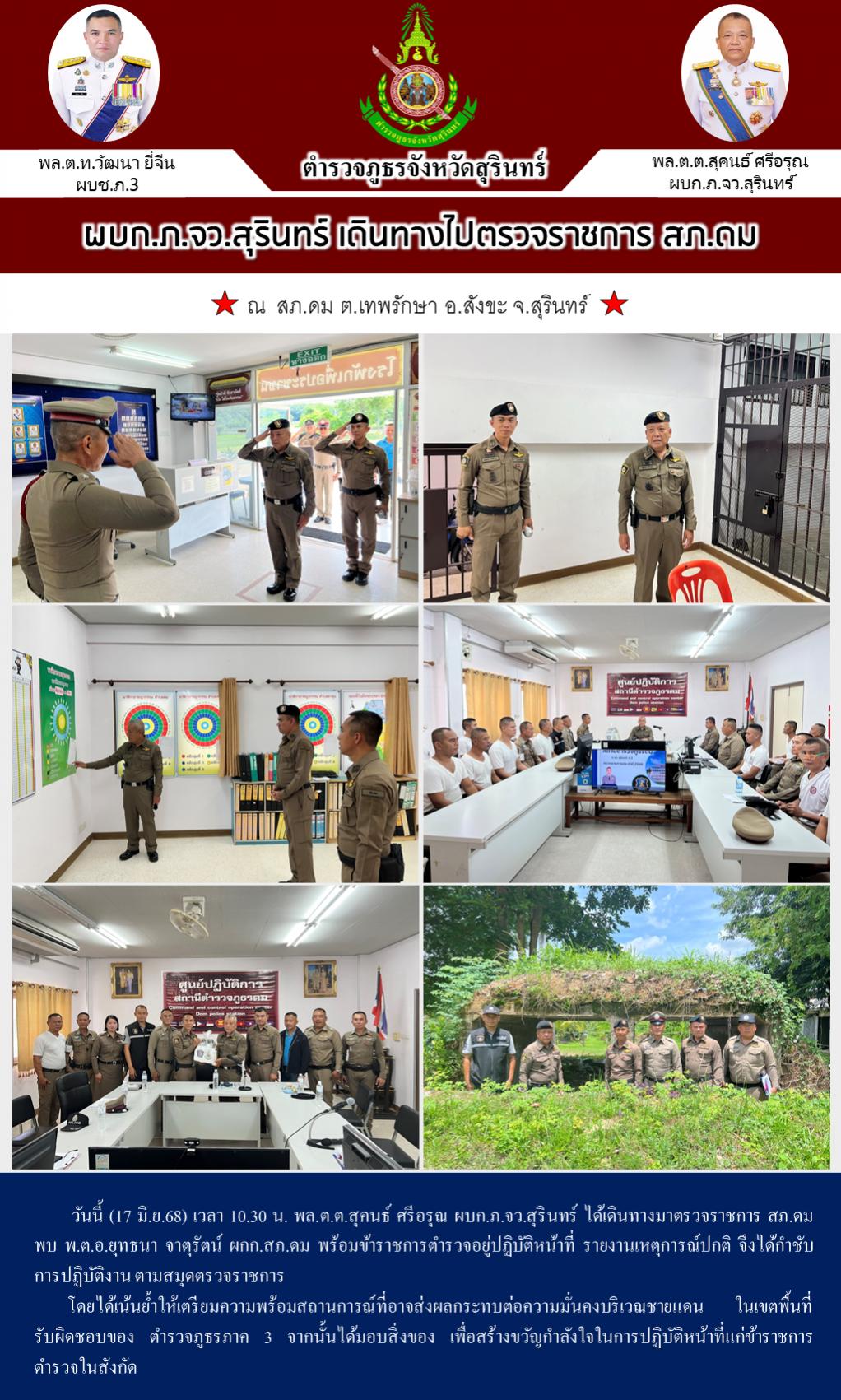 17 มิ.ย. 2568 17:32:52ผบก.ภ.จว.สุรินทร์ เดินทางไปตรวจราชการ สภ.ดม วันนี้ (17 มิ.ย.68) เวลา 10.30 น. พล.ต.ต.สุคนธ์ ศรีอรุณ ผบก.ภ.จว.สุรินทร์ ได้เดินทางมาตรวจราชการ สภ.ดม พบ พ.ต.อ.ยุทธนา จาตุรัตน์ ผกก.สภ.ดม พร้อมข้าราชการตำรวจอยู่ปฏิบัติหน้าที่ รายงานเหตุการณ์ปกติ จึงได้กำชับการปฏิบัติงาน ตามสมุดตรวจราชการ ...
