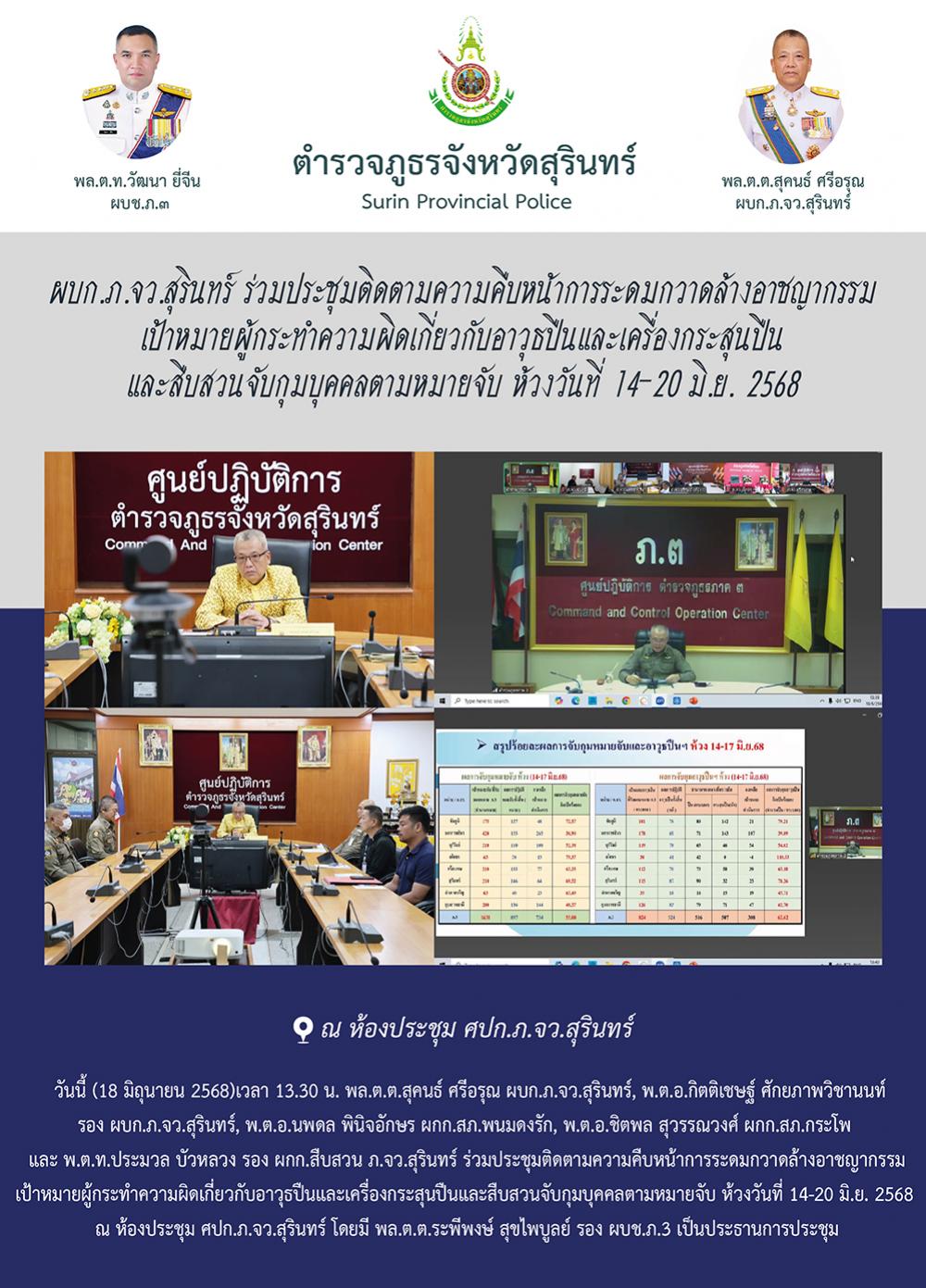 18 มิ.ย. 2568 14:53:55ผบก.ภ.จว.สุรินทร์ ร่วมประชุมติดตามความคืบหน้าการระดมกวาดล้างอาชญากรรม เป้าหมายผู้กระทำความผิดเกี่ยวกับอาวุธปืนและเครื่องกระสุนปืน และสืบสวนจับกุมบุคคลตามหมายจับ ห้วงวันที่ 14-20 มิ.ย. 2568 วันนี้ (18 มิถุนายน 2568)เวลา 13.30 น. พล.ต.ต.สุคนธ์ ศรีอรุณ ผบก.ภ.จว.สุรินทร์, พ.ต.อ.กิตติเชษฐ์ ศักยภาพวิชา...