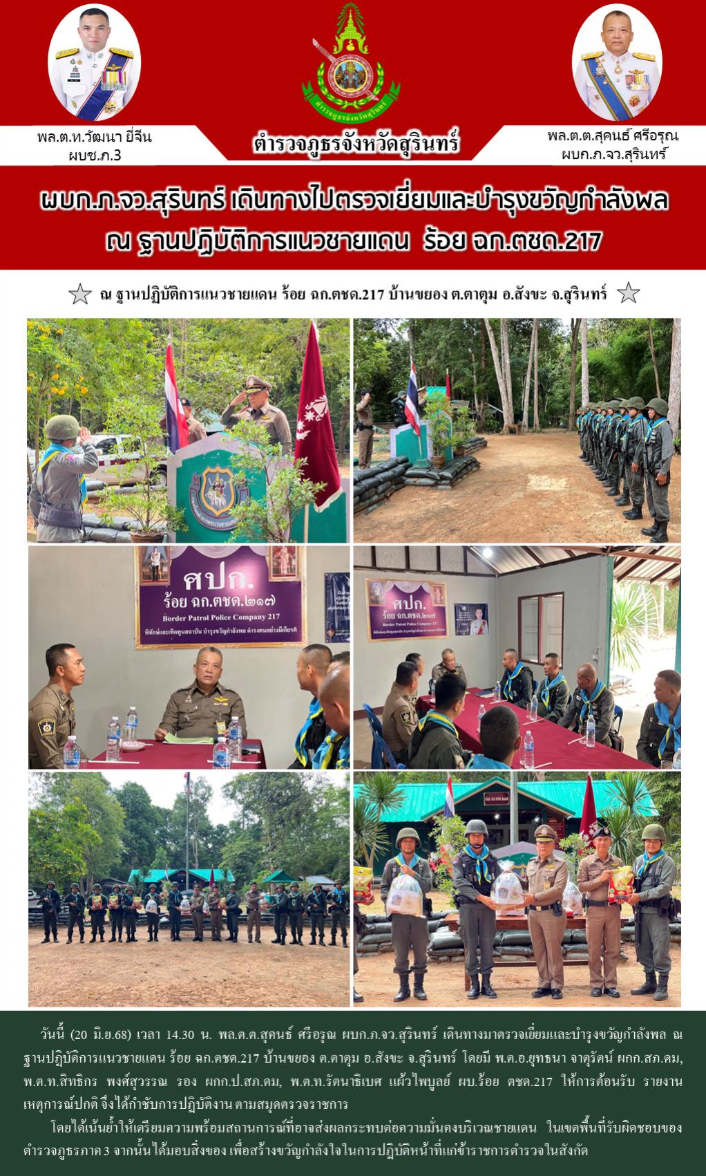 20 มิ.ย. 2568 19:51:52ผบก.ภ.จว.สุรินทร์ เดินทางไปตรวจเยี่ยมและบำรุงขวัญกำลังพล ณ ฐานปฏิบัติการแนวชายแดน ร้อย ฉก.ตชด.217 วันนี้ (20 มิ.ย.68) เวลา 14.30 น. พล.ต.ต.สุคนธ์ ศรีอรุณ ผบก.ภ.จว.สุรินทร์ เดินทางมาตรวจเยี่ยมและบำรุงขวัญกำลังพล ณ ฐานปฏิบัติการแนวชายแดน ร้อย ฉก.ตชด.217 บ้านขยอง ต.ตาตุม อ.สังขะ จ.สุรินทร์ โดยม...