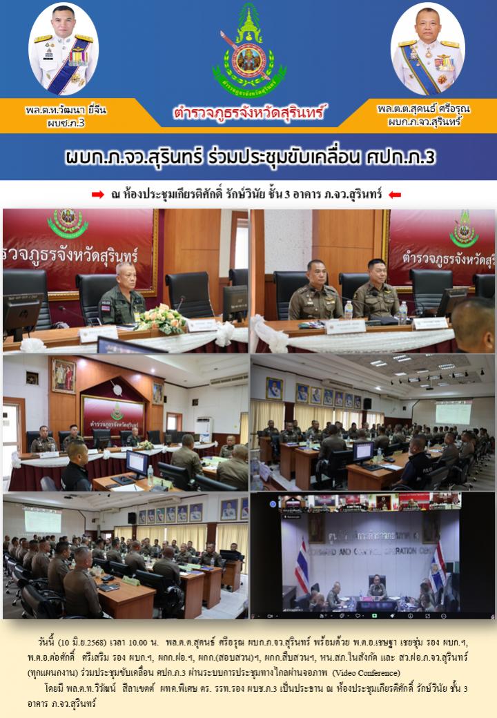 10 มิ.ย. 2568 17:14:55ร่วมประชุมขับเคลื่อน ศปก.ภ.3 วันนี้ (10 มิ.ย.2568) เวลา 10.00 น. พล.ต.ต.สุคนธ์ ศรีอรุณ ผบก.ภ.จว.สุรินทร์ พร้อมด้วย พ.ต.อ.เชษฐา เชยชุ่ม รอง ผบก.ฯ, พ.ต.อ.ต่อศักดิ์ ศรีเสริม รอง ผบก.ฯ, ผกก.ฝอ.ฯ, ผกก.(สอบสวน)ฯ, ผกก.สืบสวนฯ, หน.สภ.ในสังกัด และ สว.ฝอ.ภ.จว.สุรินทร์ (ทุกแผนกงาน) ร่วมประชุมขับเคลื่อน ศปก...